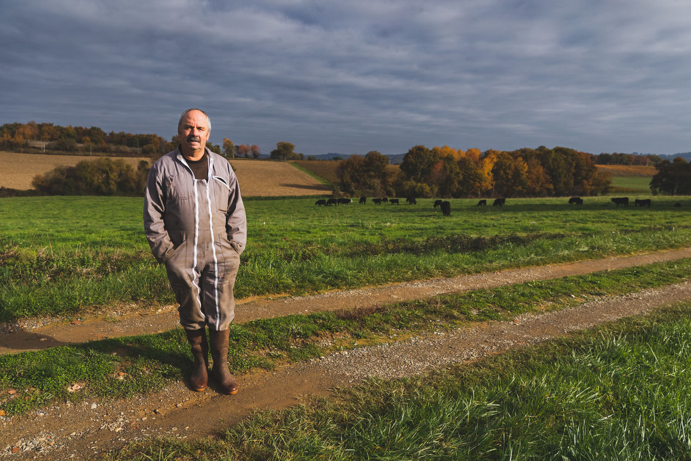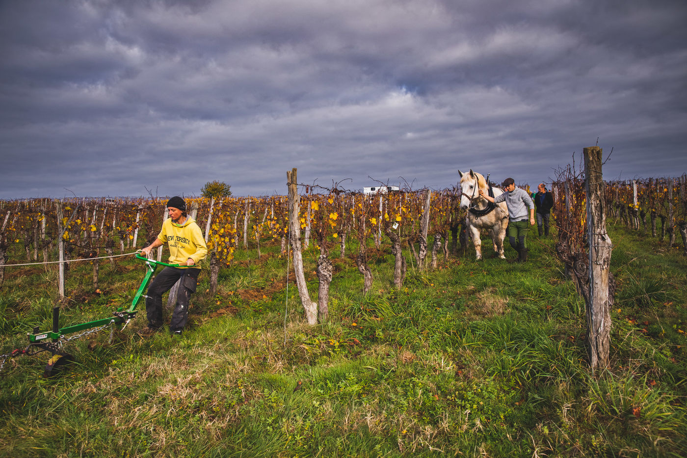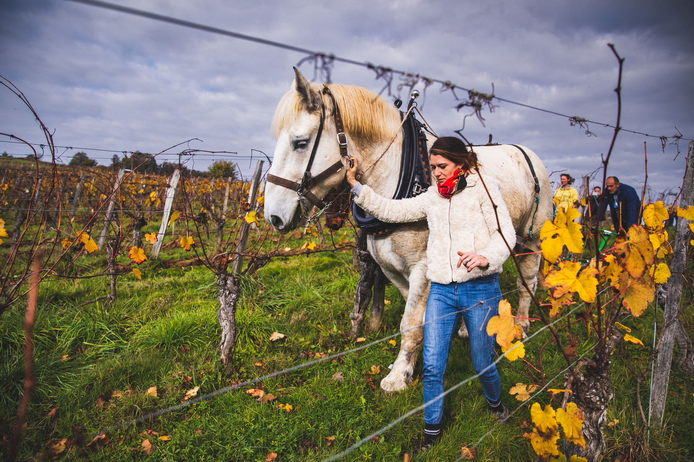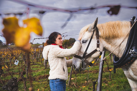 During this autumnal week, Simon's rows of vines are dressed in gold. On the horizon at the top of the hillside surrounded by scarlet trees, the silhouettes of Gilles, Marie, Coco and Dino, followed by Simon's one, are gradually taking shape. Coco the hardened, a black horse Trait du Nord, and Dino the apprentice, a white horse Percheron, are moving to the sound of Marie and Gilles' gentle injunctions. Gilles praises Coco for his skills, intelligence, power and outstanding endurance.