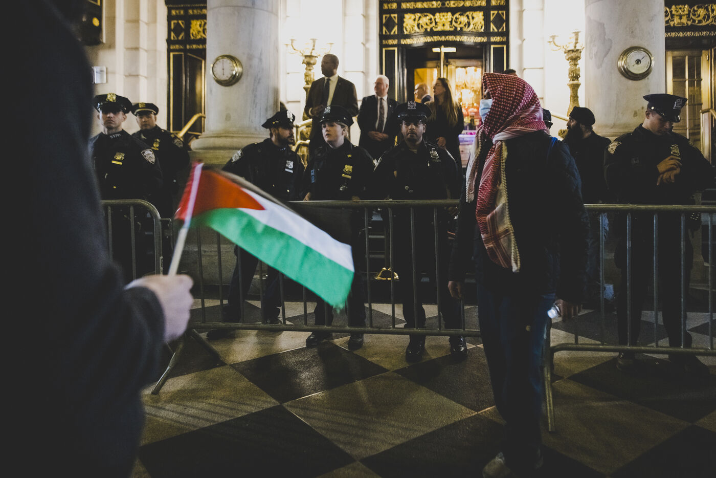 Un petit groupe de manifestants pro palestiniens a protesté contre la venue du Président d'Israël Isaac Herzog à l'hôtel Plaza à New York.