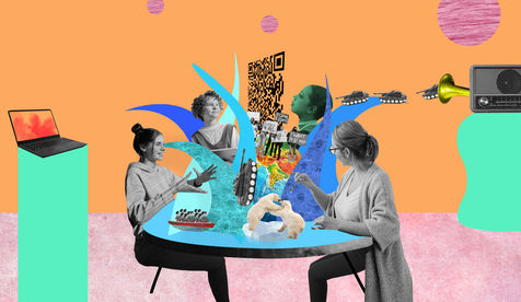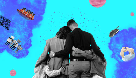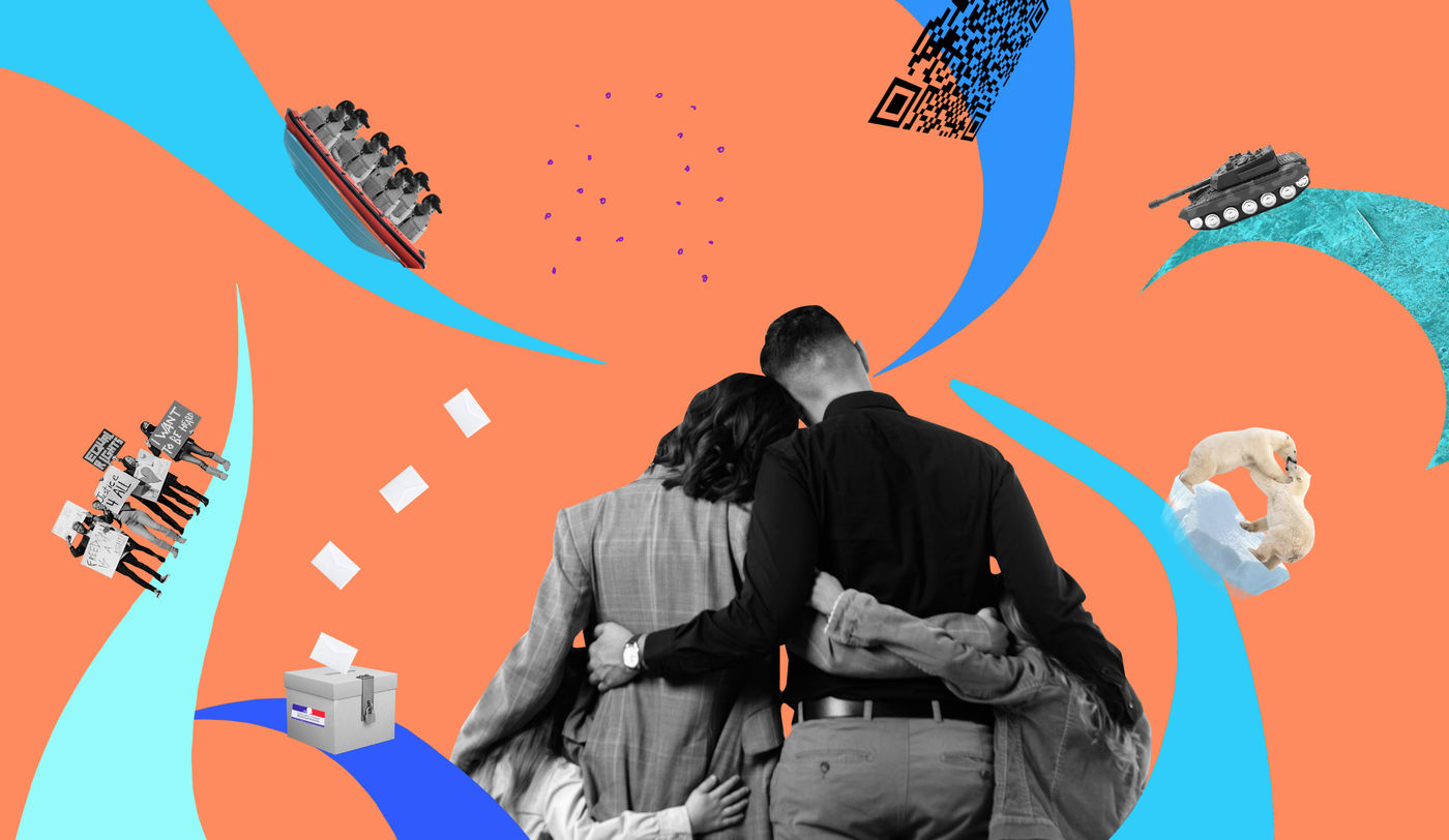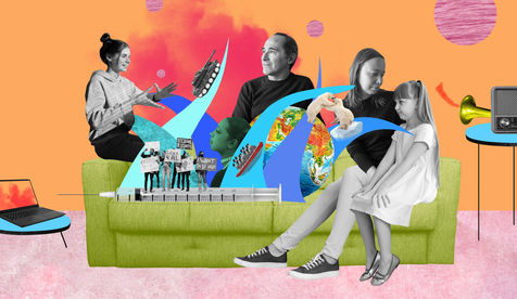 A series of collages that tell how parents talk about current events and information broadcast on the radio, internet or television with their children: Ecology, war, refugees, culture