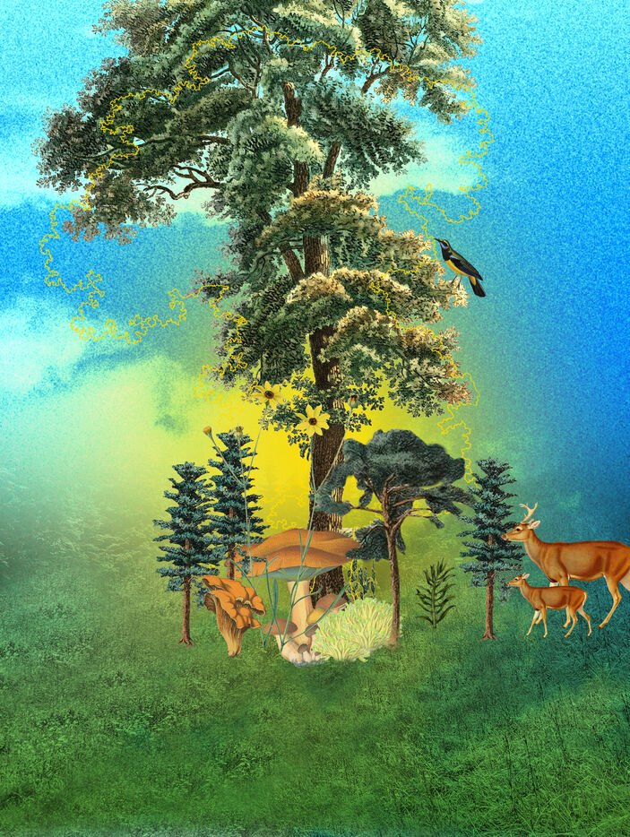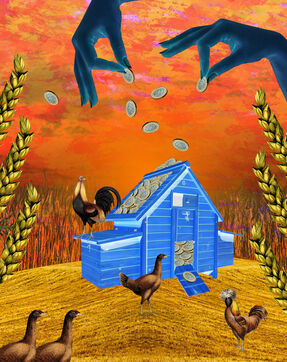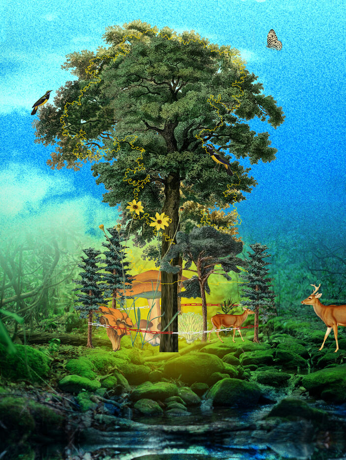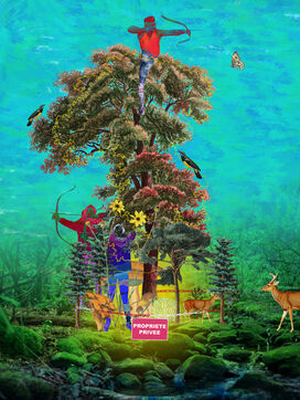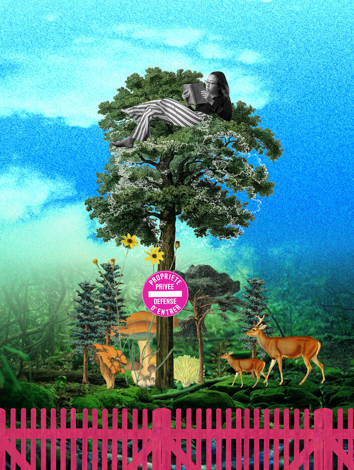 Série de collages et photomontages autour des thématiques écologiques : achat des foret par des citoyens pour les protéger, fonte des glaces, disparition des centres villes dans les villages au profit d'entrées de ville "moches", investissements des particuliers dans des fermes maraîchères .