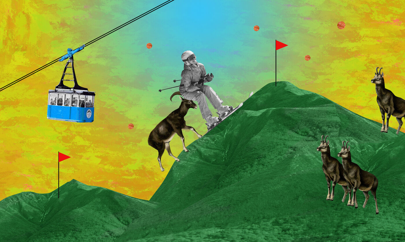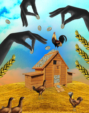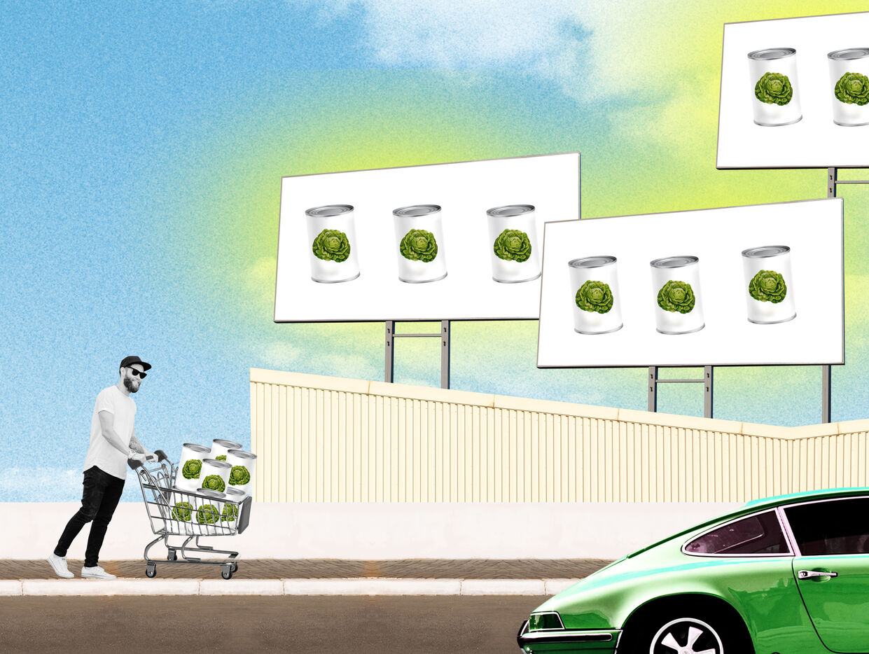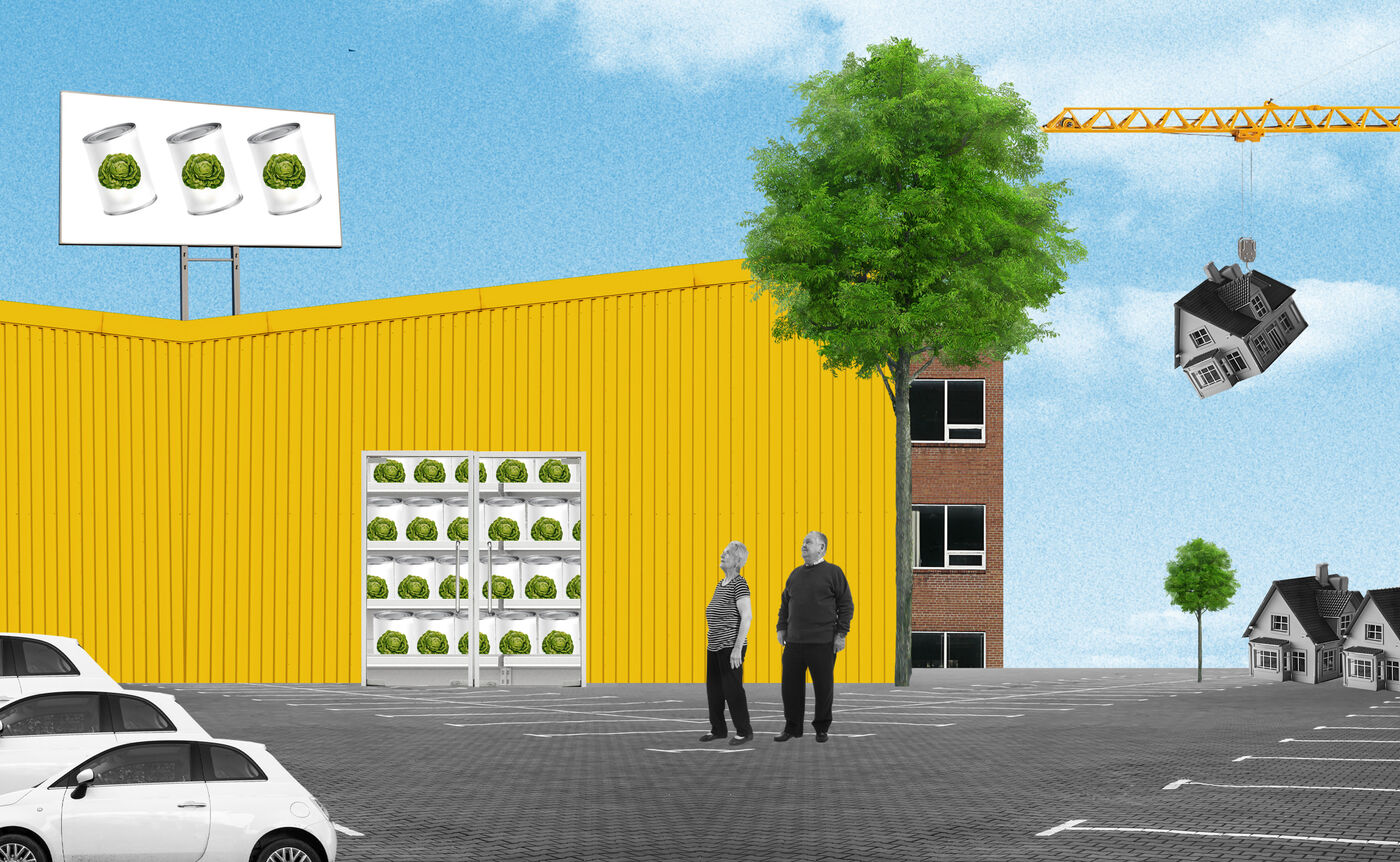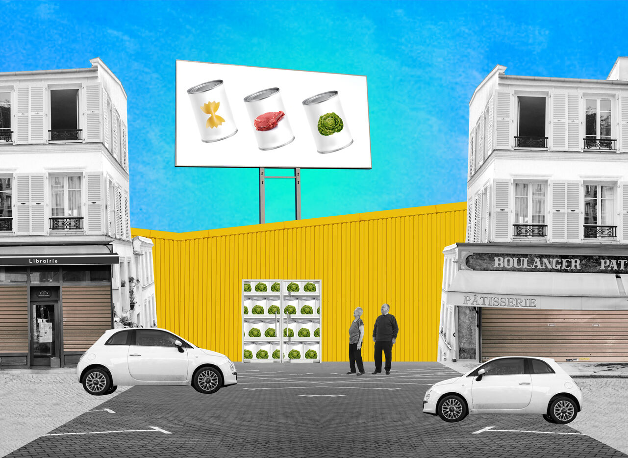 A series of collages and photomontages based on ecological themes: citizens buying up forests to protect them, melting ice, the disappearance of town centers in villages in favor of “ugly” city entrances, private investments in market-garden farms .