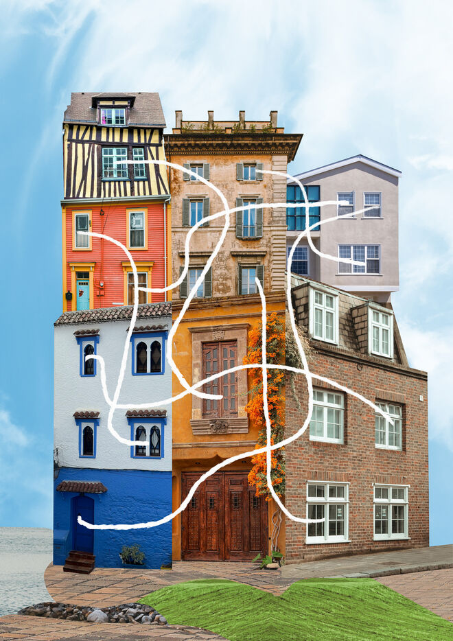 Série de collages sur le thématique des touristes qui échangent leurs maisons pour les vacances à travers le monde