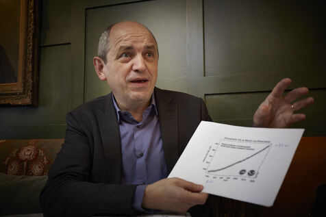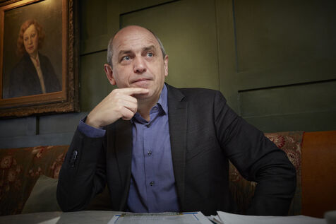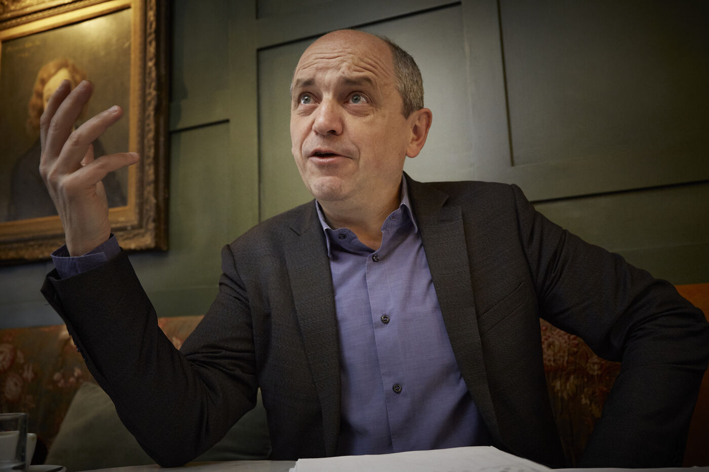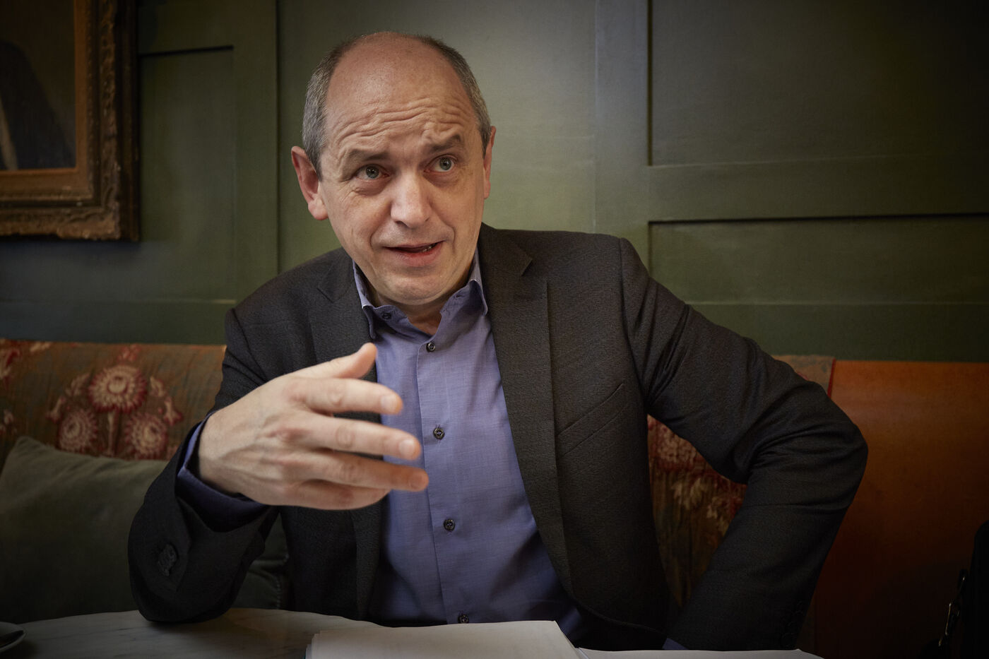 Pierre Larrouturou, economiste et membre du parlement europeen est interviewe dans un cafe parisien sur sa vision du financement de la transition écologique : le Pacte Finance-Climat.