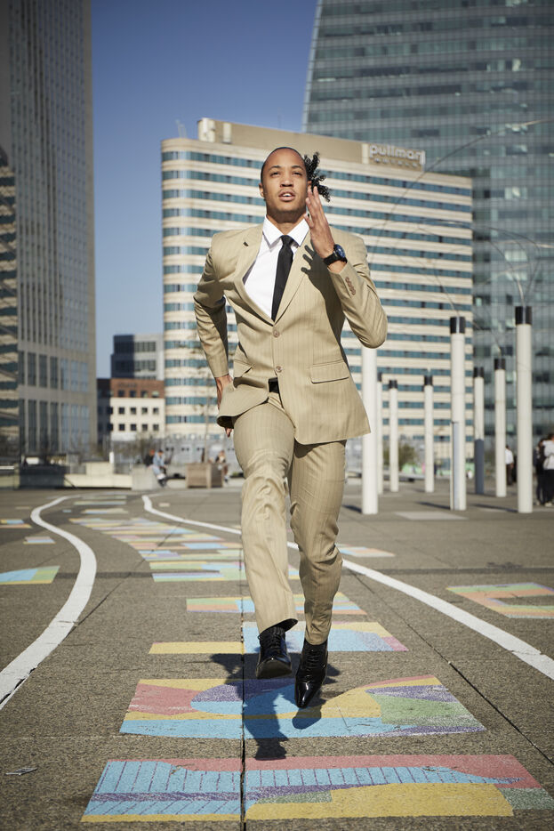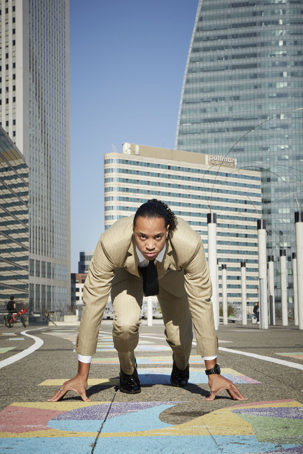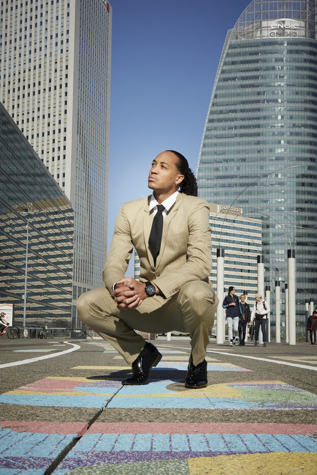 Pascal Martinot Lagarde, athlète français, spécialiste du 110 mètres haies et détenteur du record de France du 110 mètres haies en 12 s 95, pose pour une série de portrait dans le quartier de la Défense.