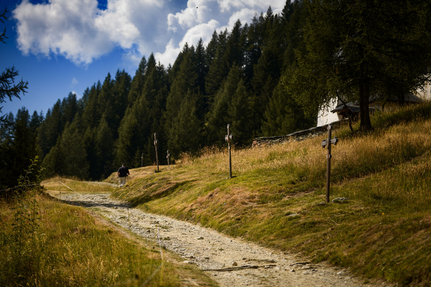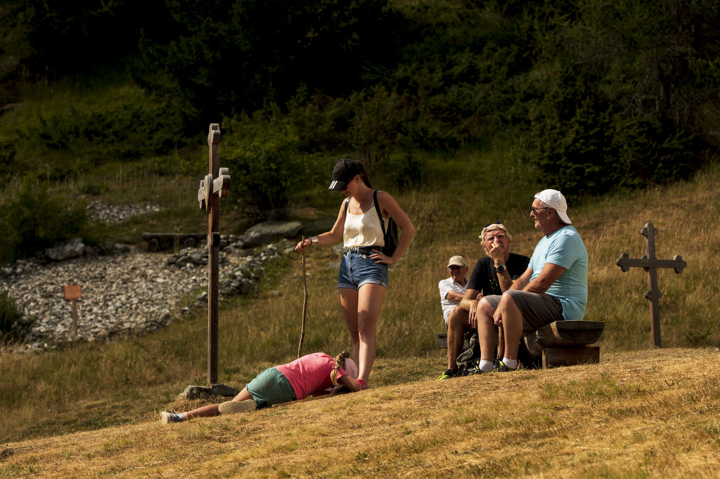 Une atmosphère de lumières particulaires, de bois ajourés, dans les hauteurs préservées, au fil d'un chemin de croix gorgé de soleil. En fin de journée, particulièrement, l'étirement des ombres des croix sur les sentiers confère à la marche une aura spirituelle. Marcher. Respirer. Se croiser en se souhaitant une « bonne journée » qui résonne. Ici, les bâtons de pèlerins se confondent avec les bâtons de marche nordique. Et c'est en famille, toutes générations confondues, que l'on gagne assez simplement, en short et solides chaussures de marche, la chapelle du XVIIIe siècle, le sanctuaire marial, les eaux bienfaisantes...