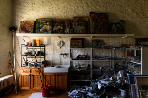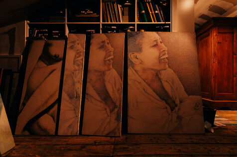 He has not painted in three years. The work demands too much attention to detail, exhausting precision. Yet he has preserved his studio intact, like a living installation, a testimony to a practice shaped by time and its traces.