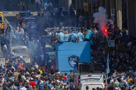 HAC Ligue 1 climb: Parade in the rue de Paris by imperial bus, after their final victory over Dijon in league 2 BKT, the HAC is champion of Ligue 2 BKT and goes up to league 1 next season.