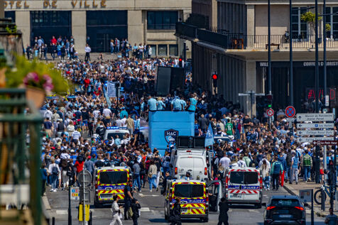 Montée HAC Ligue 1 : Parade dans la rue de Paris en bus impérial, après leur victoire finale sur Dijon en ligue 2 BKT, le HAC est champion de Ligue 2 BKT et monte en ligue 1 la saison prochaine.