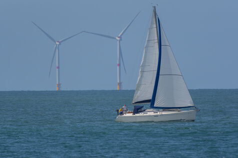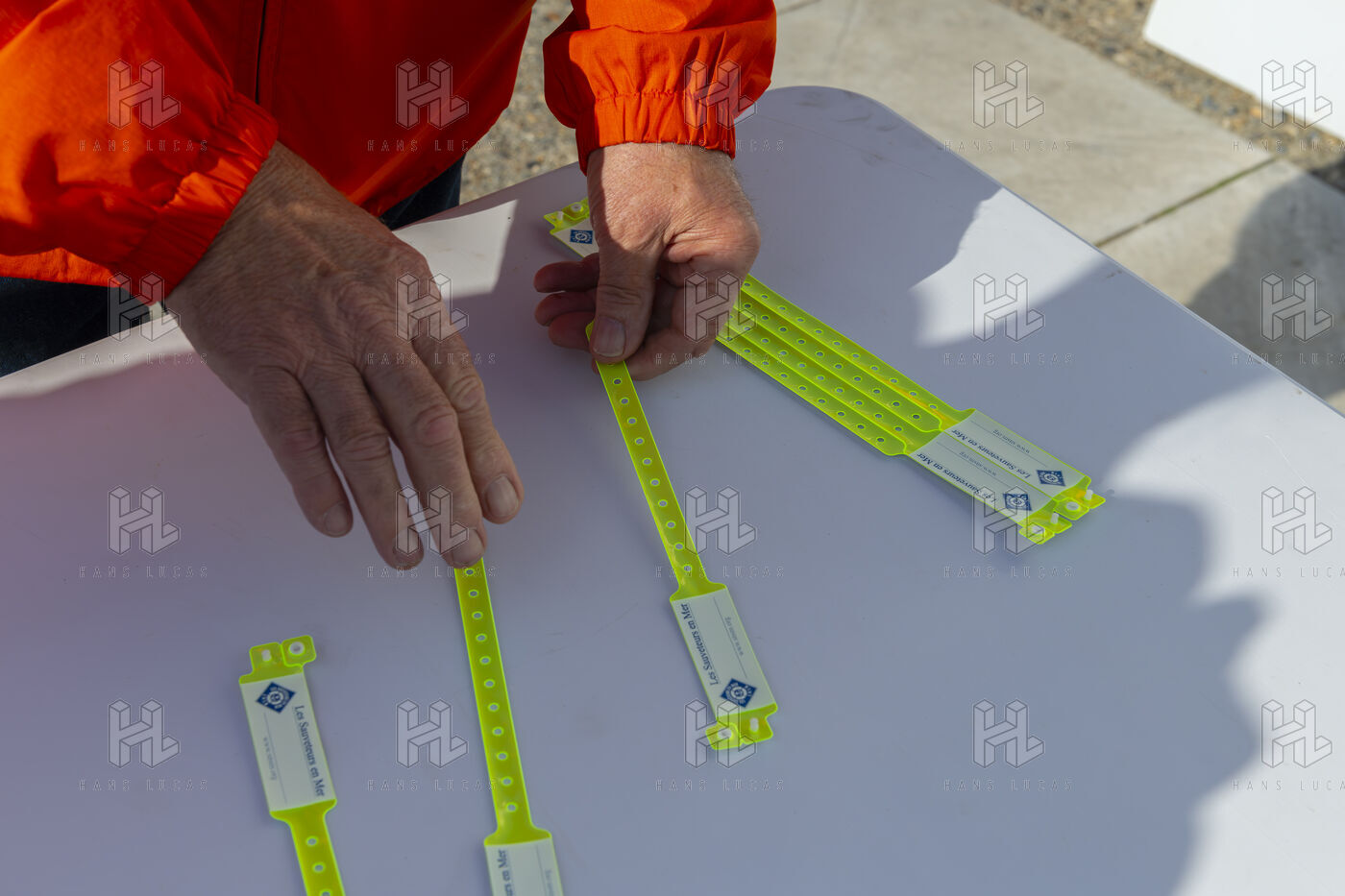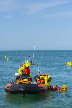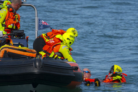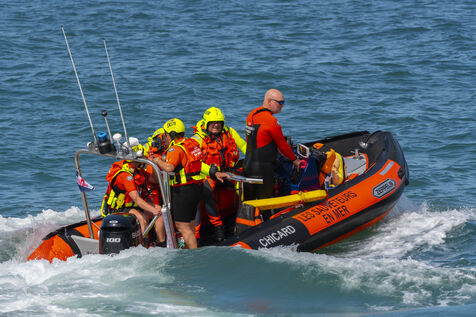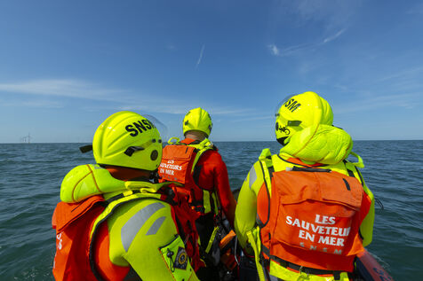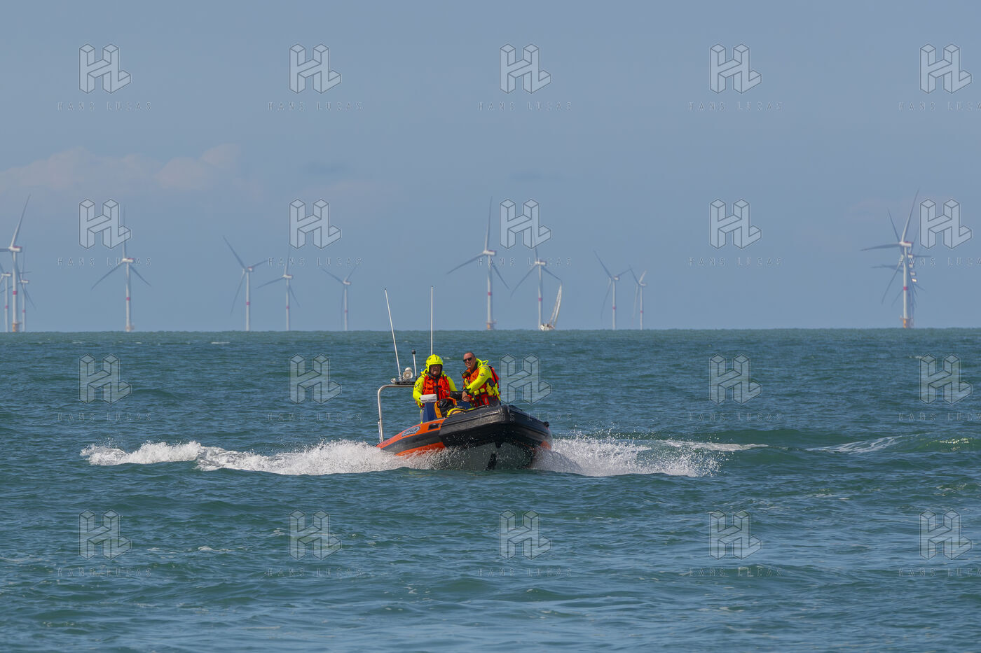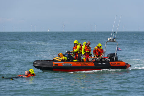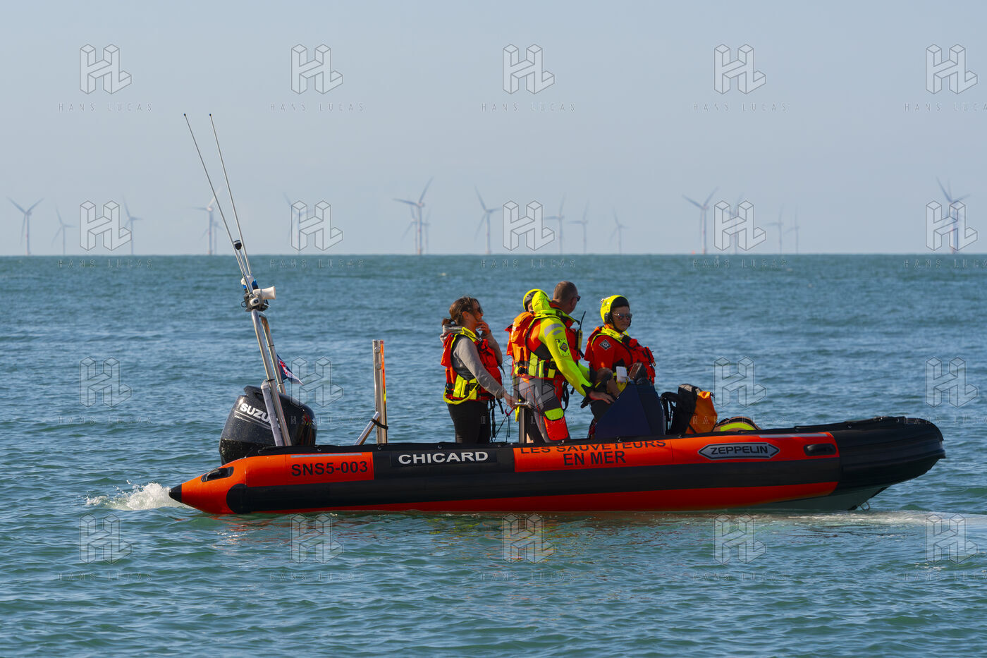 La SNSM d'Yport en Seine Maritime, effectue des exercices de sauvetages devant la baie d'Yport, une belle journée enseoleillée de Juillet, les éoliennes offshore de Fecamp sont en fond, des bateaux, voiliers, la falaise montre l'érosion du au climat, un petit garçon demande un bracelet au responsable de la station de la SNSM d'Yport monsieur Jean Luc Lars.