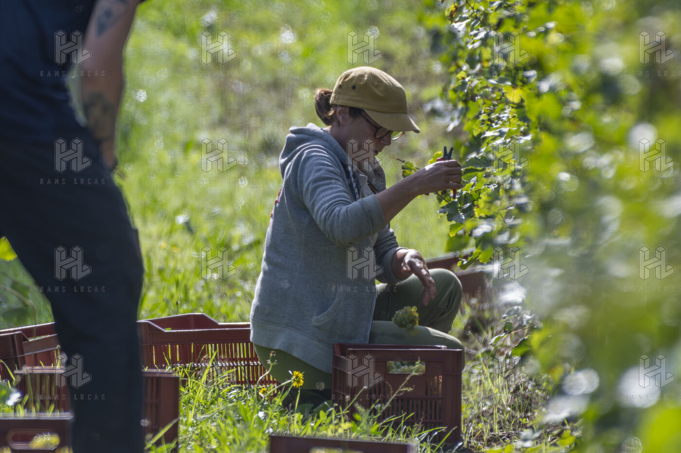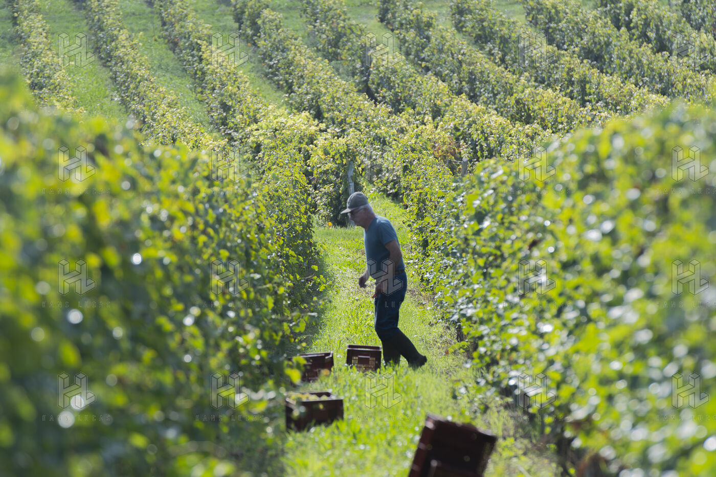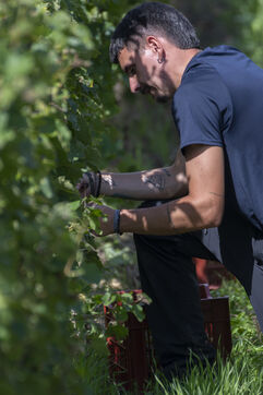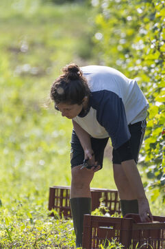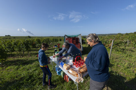Harvesting of the white Chenin grape, in the vineyards of Sandrine and Christophe Deschamps organic producer, the harvest of the precious white Chenin grape is carried out with many seasonal workers, harvesters who go through each row of vines in search of the bunches of white grapes, which will give this delicious nectar that is Chenin. A lot of work and good humor, music that resounds from portable speakers, enthusiasm and a lot of sweat and back pain. Fortunately then the time for sharing around snacks and small meals punctuates the day.