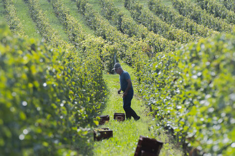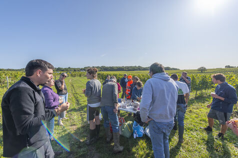 Vendanges du raisin blanc chenin, dans les vignes de Sandrine et Christophe Deschamps vignerons bio, la récolte du précieux raisin blanc Chenin s'effectue avec de nombreux saisonniers, des vendangeurs qui parcourent chaque rang de vignes à la recherche des grappes de raisin blanc, qui donneront ce délicieux nectar qu'est le chenin. Beaucoup de travail et de bonne humeur, de la musique qui retentit des enceintes portatives, de l'entrain et beaucoup de sueur et de mal de dos. Heureusement ensuite le temps du partage autour de collations et petits repas viennent ponctuer la journée.