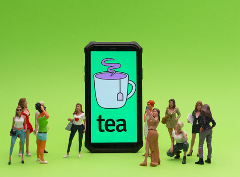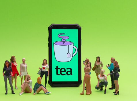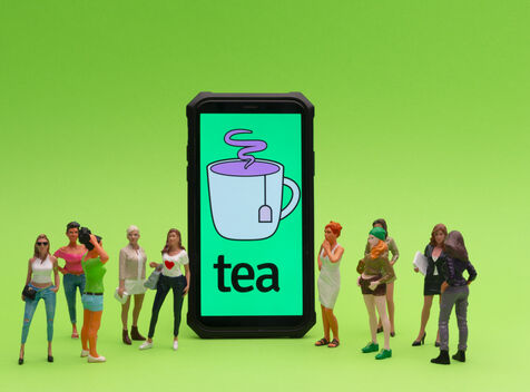 Tea est une appli qui vise à «aider les femmes à faire des rencontres en toute sécurité» en leur permettant de partager des informations sur l’homme avec qui elles sortent ou envisagent de sortir. Tout cela anonymement.Une notation avec des drapeau rouge ou vert sont appliqué pour savoir si les hommes sont recommandables. Ici ce sont de petits personnages mis en situation à coté d'un téléphone avec le logo de l'appli, des femmes et des hommes.
