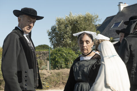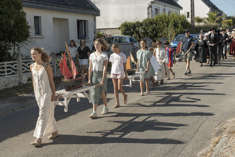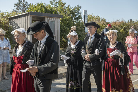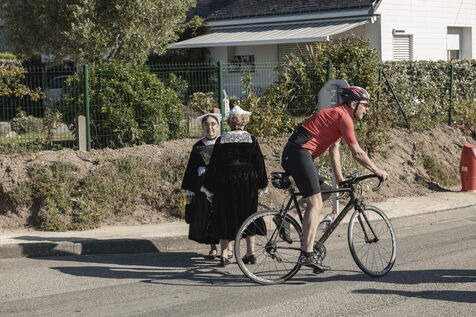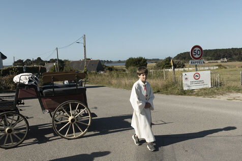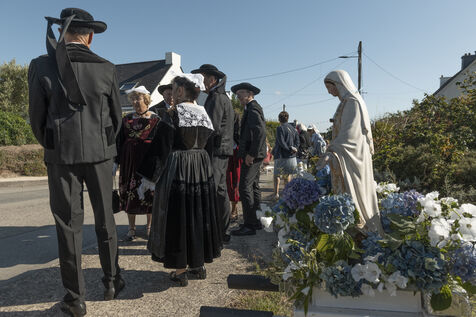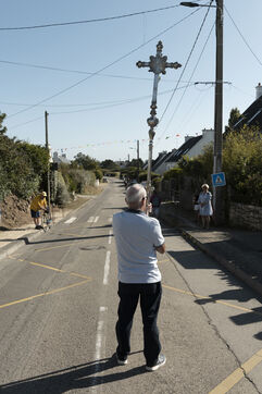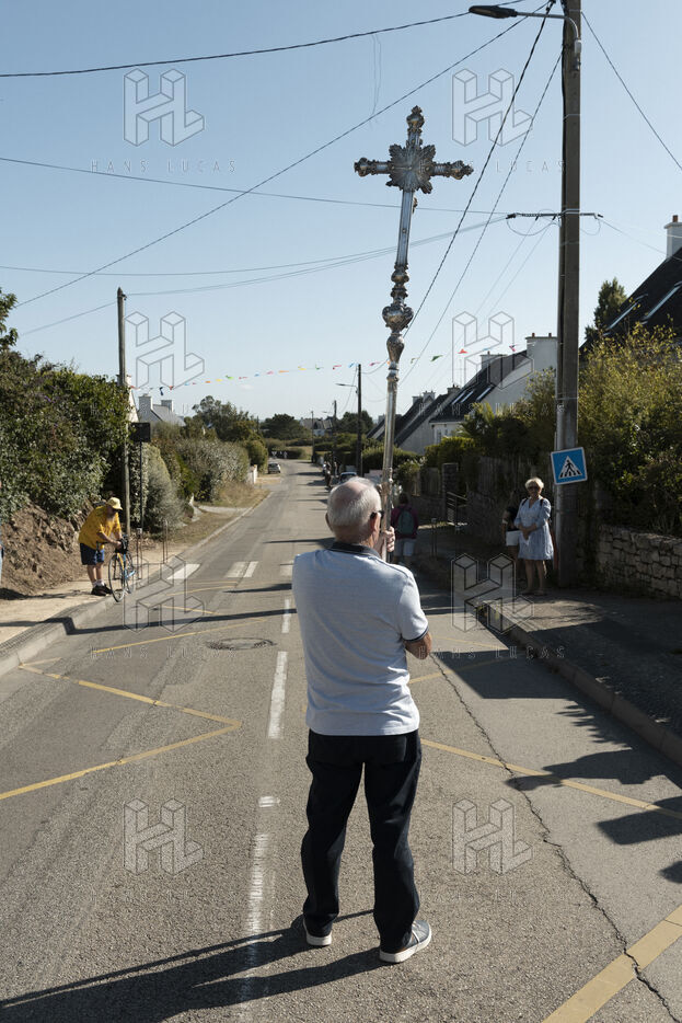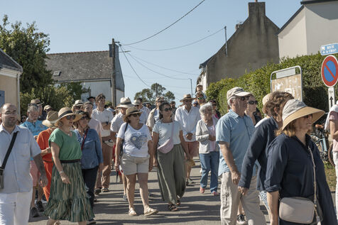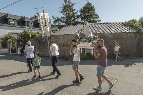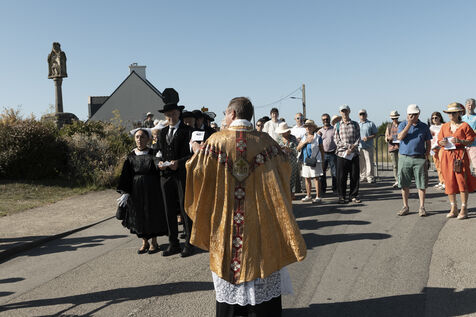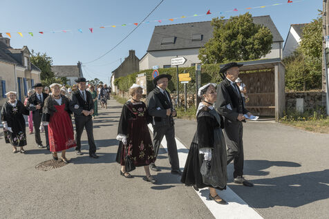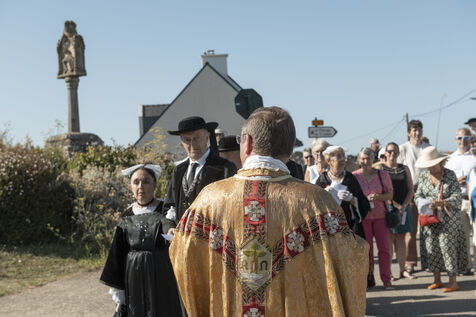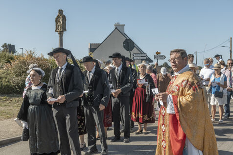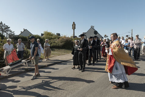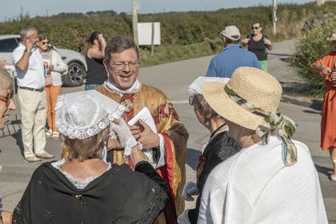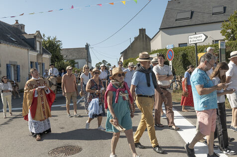 40 years of the pardon of Kerarden in the town of Séné in Morbihan, this Catholic procession from the calvert to the church of Kerarden in the center of the village, the priest as well as many faithful make this march, men, women children, a beautiful sunny day in Brittany with the Sunday mass in focus.