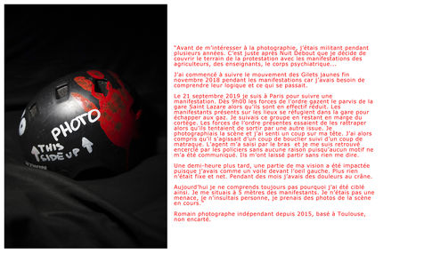 These images and testimonies are not the fruit of an imagination or a fiction but very real and lived. Without doing an exhaustive inventory, we could almost see it as a cabinet of curiosities as there are astonishing things that photographers, reporters, journalists, professionals, students, inset, non-inset enthusiasts carry on them to protect their physical integrity during the demonstrations in France for more than a year.