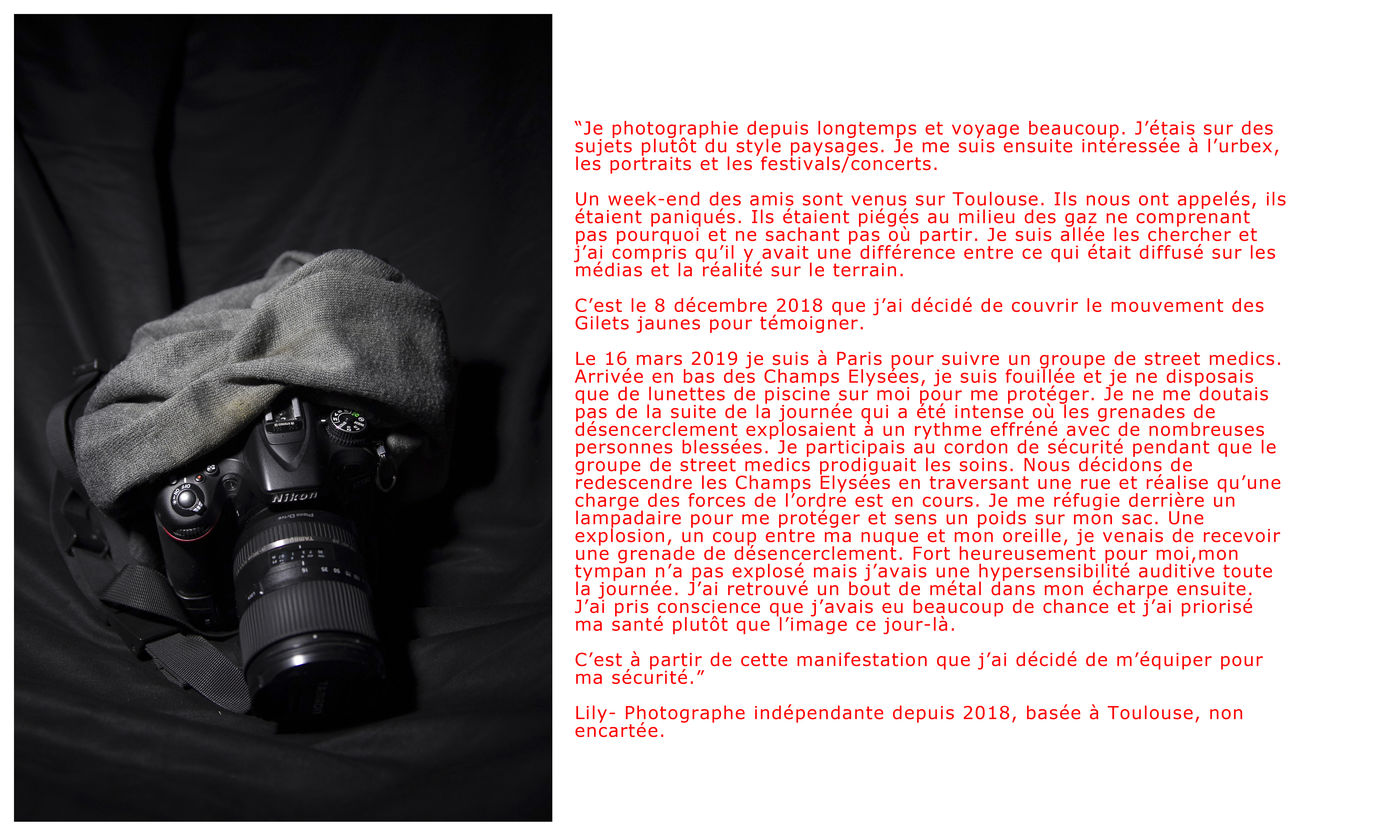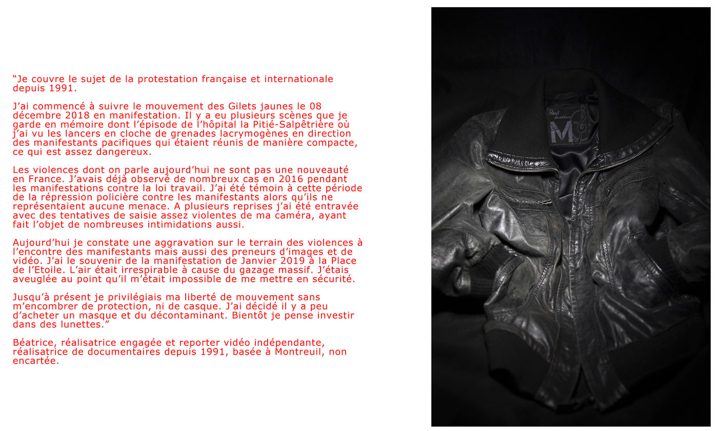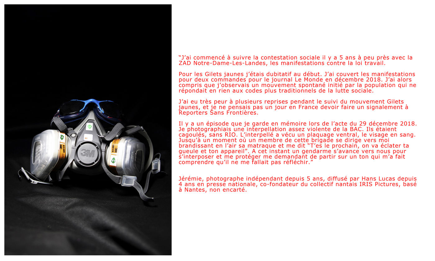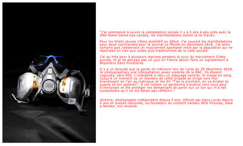 Ces images et témoignages ne sont pas le fruit d'un imaginaire ou d'une fiction mais bien réels et vécus. Sans faire un inventaire exhaustif, on pourrait presque y voir un cabinet de curiosités tant il y a de choses étonnantes que les photographes, reporters, journalistes, professionnels, étudiants, amateurs, encartés, non encartés portent sur eux pour protéger leur intégrité physique pendant les manifestations en France depuis plus d'une année.
