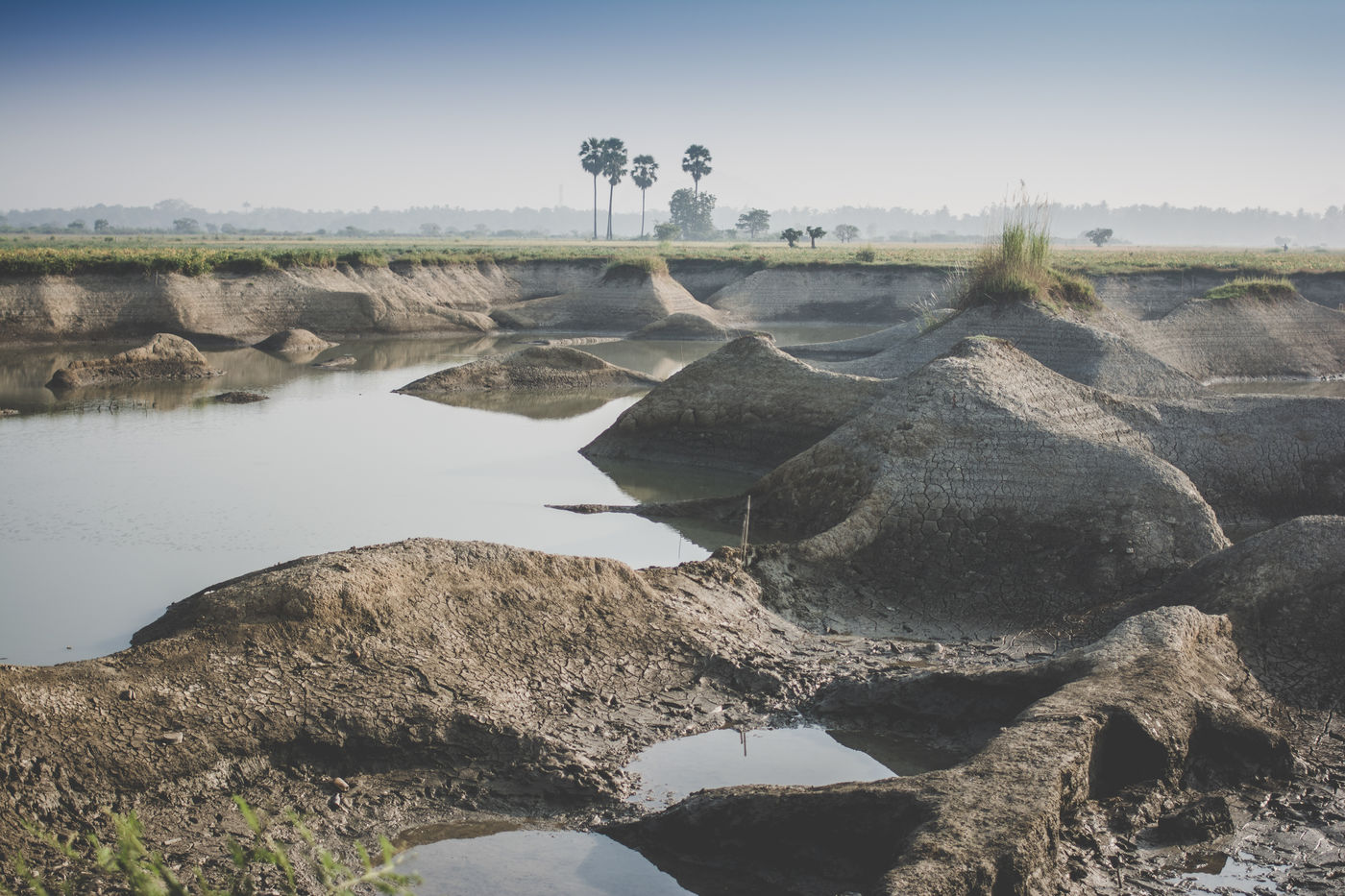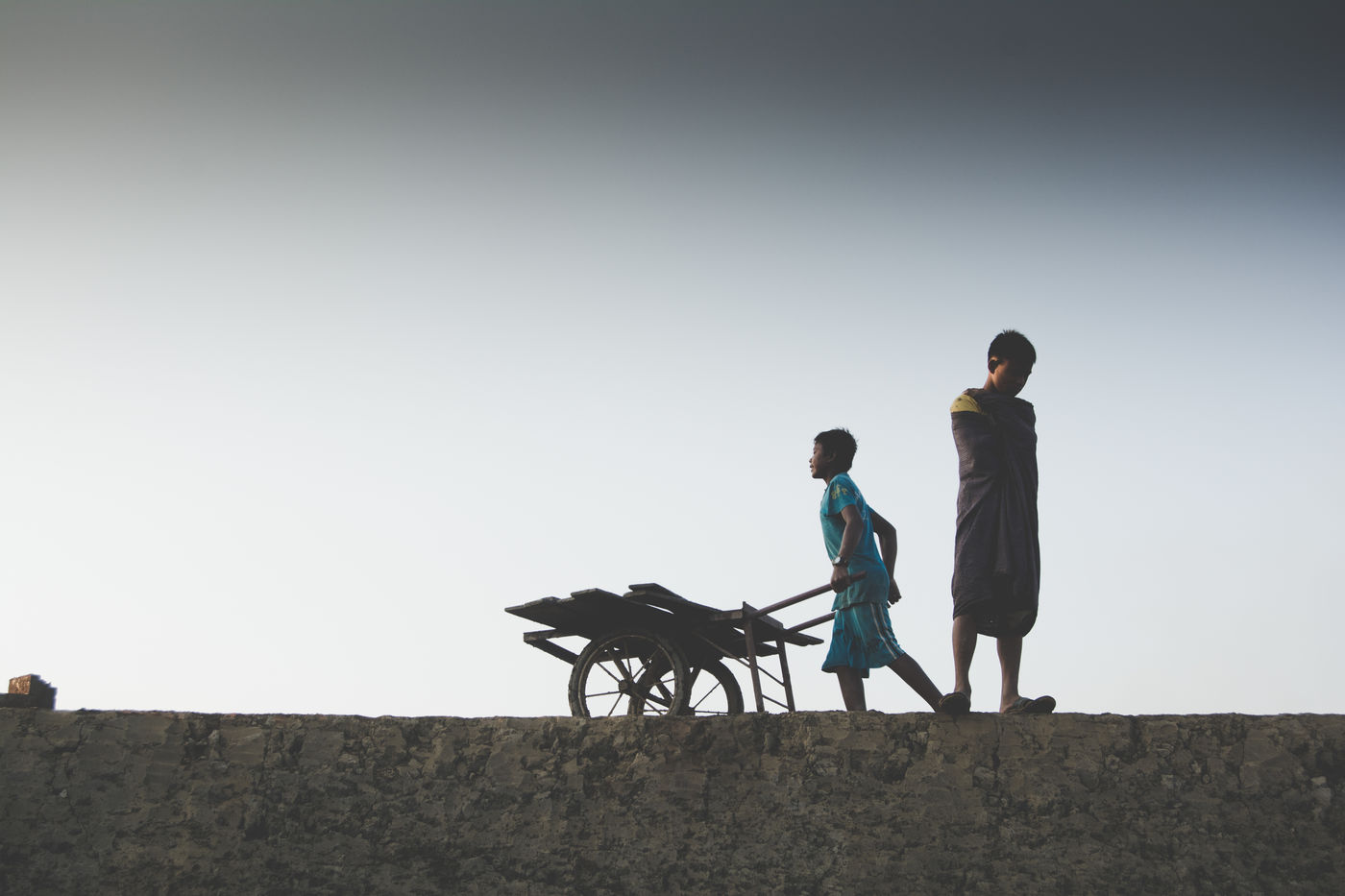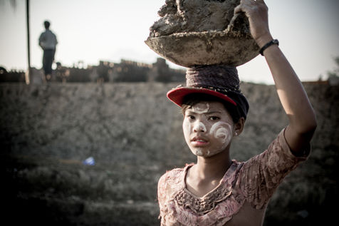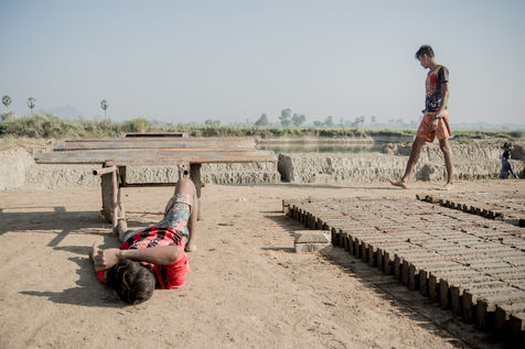 Un champ de briques attend à être séché. Des habitations de fortunes, éphémères, sont venues marquer la limite d?une carrière d?argile à la sortie de Hpa-An, en Birmanie. Des coups de pioches rythment l?exploitation, quand la rotation des porteuses en fait la danse. Nous sommes au c?ur d?une communauté d?une trentaine de familles, se retrouvant chaque année pour une saison de six mois, dans la usine de briques. Ici, chaque membre à son utilité dans la chaîne de productions, quand l?âge définit le poste. Si cette exploitation donne du travail aux plus jeunes, elle l?interdit aux moins de 13 ans, offre deux jours de repos par semaine et restreint la plage horaire. Des règles bienvenues pour une enfance aux pieds d?argile. En 2013, 168 M d?enfants dans le monde seraient concernés par le travail, dont 85 Millions dans des conditions dangereuses selon le Bureau International du Travail