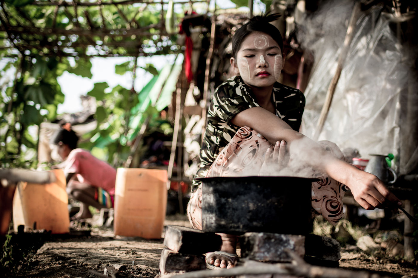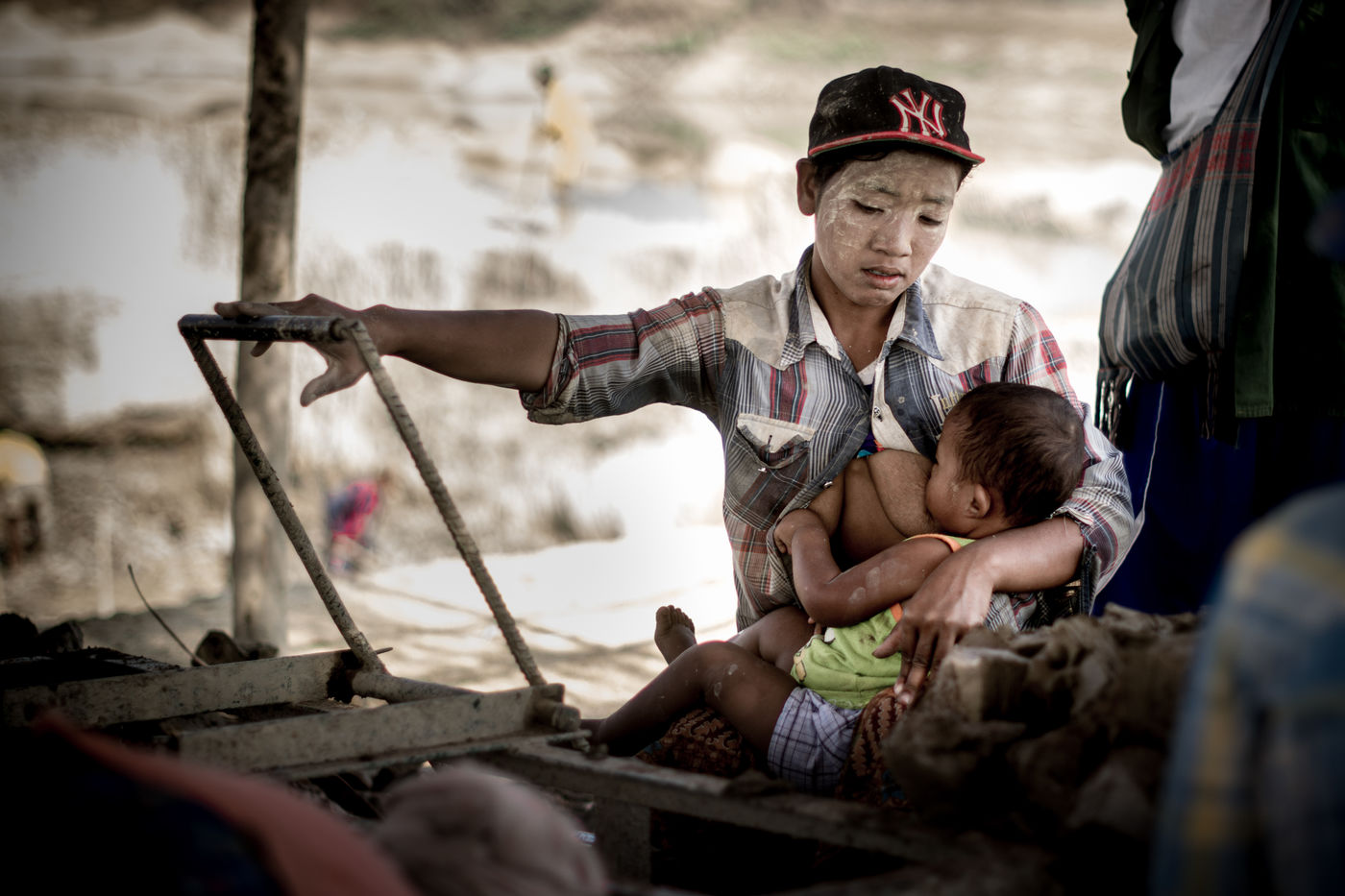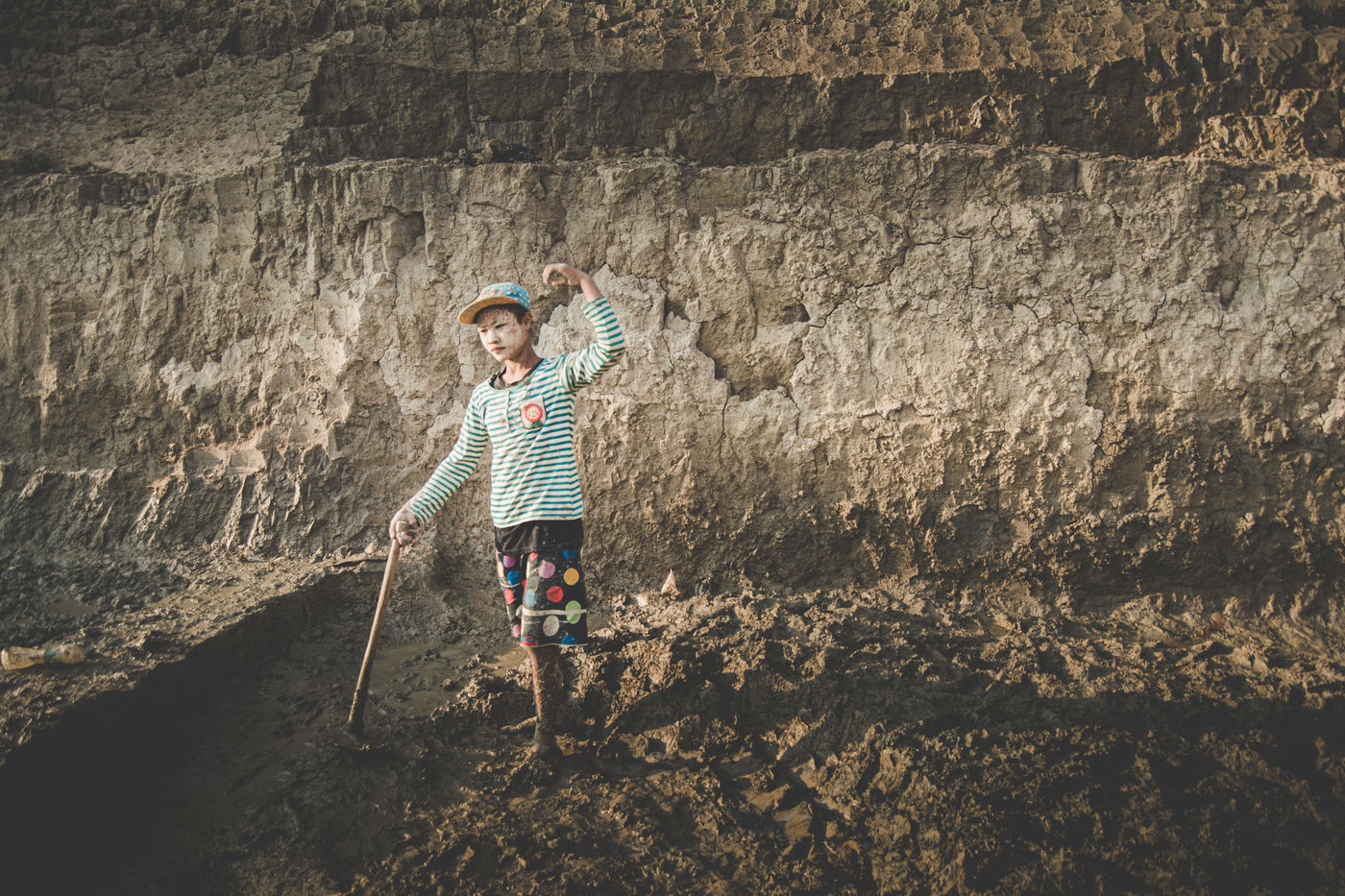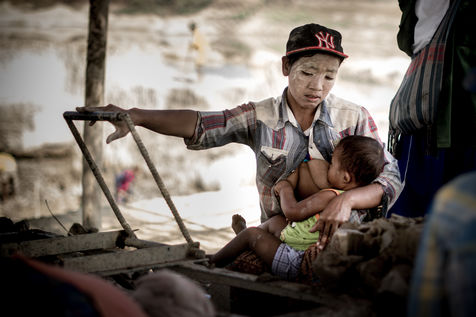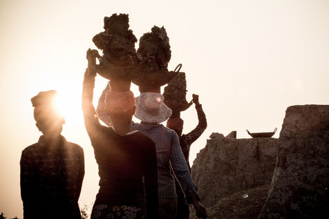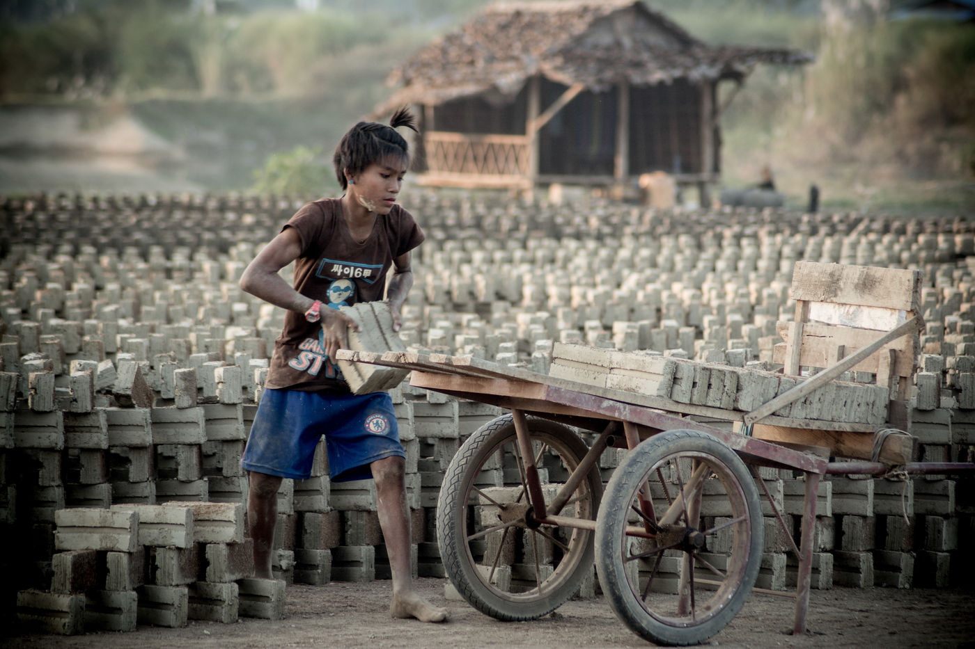A field of bricks waits to be dried. Ephemeral makeshift dwellings have come to mark the edge of a clay quarry outside Hpa-An, Burma. The rhythm of the quarry is set by the rhythm of the pickaxes, while the rotation of the porters makes the dance. We are in the heart of a community of about thirty families, who meet every year for a six-month season in the brick factory. Here, each member has a role to play in the production chain, where age defines the position. If this operation gives work to the youngest, it forbids it to those under 13 years old, offers two days off per week and restricts the working hours. These are welcome rules for a childhood with feet of clay. In 2013, 168 million children in the world were involved in child labour, 85 million of them in dangerous conditions according to the International Labour Office.