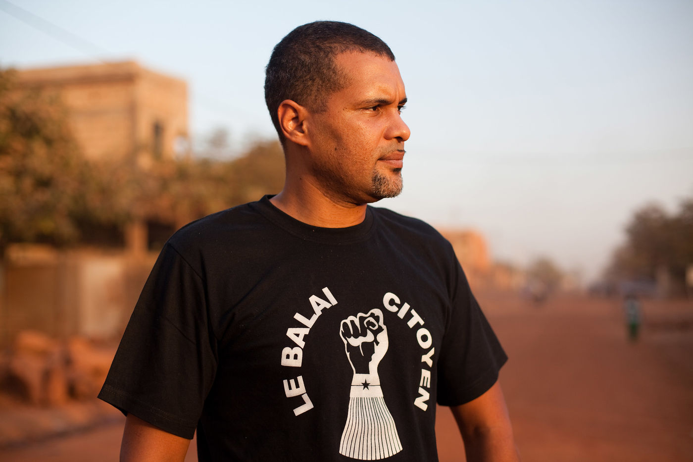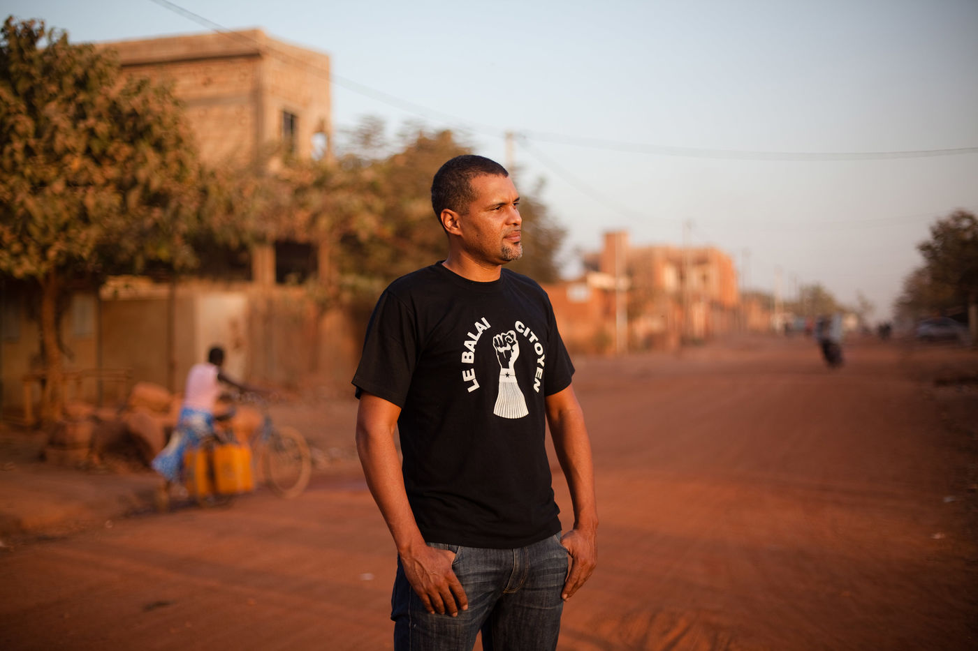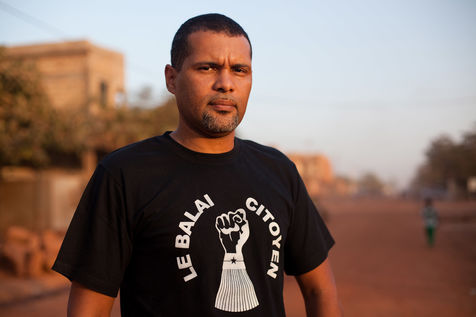 L'artiste musicien Smockey, posant en 2014 dans son quartier, où il tient un studio d'enregistrement nommé Abazon. Rappeur, producteur, Smockey est aussi un des membres fondateur du mouvement de la société civile Le Balai Citoyen, qui a été un fer de lance de la mobilisation dans les quartiers les jours précédents l'insurrection populaire du 30 et 31 octobre 2014.
