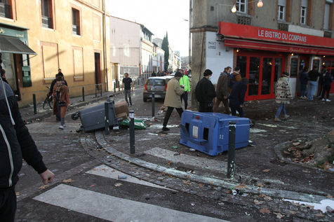 Affrontements entre la police et avec un groupe de gilets jaunes venu en découdre lors de la manifestation de la marche du climat et l'acte IV du mouvement des gilets jaunes mouvement de contestation des citoyens francais apparu sur les reseaux sociaux contre la hausse des taxes sur les carburants, la hausse des impots, le pouvoir d'achat contre le gouvernement et le president Macron. Toulouse, France - 8 Decembre 2018.