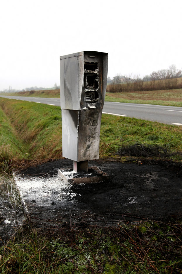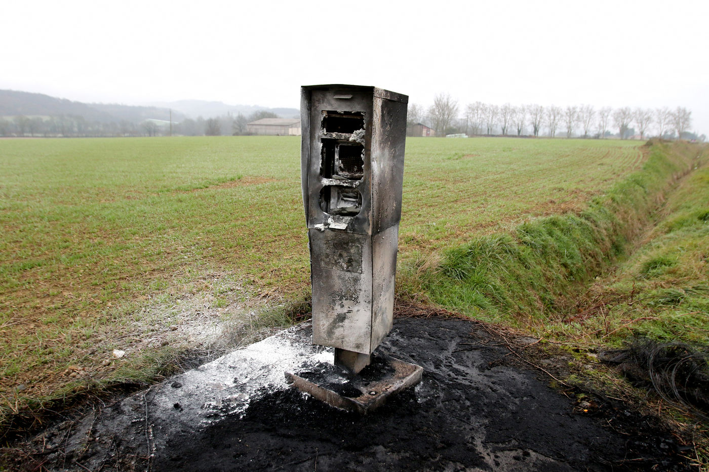 An automatic speed control radar completely destroyed by criminal fire on the side of the RD 929 departmental road.