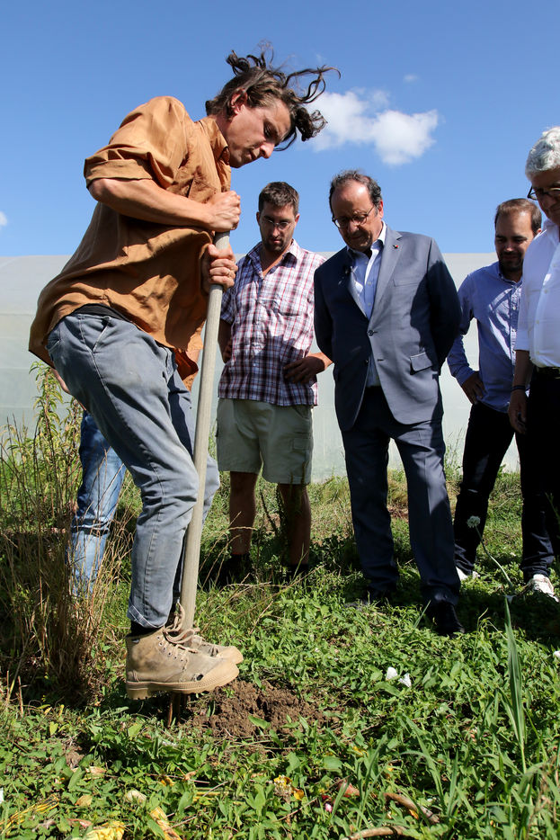 Francois Hollande, former President of the French Republic, visits an organic farm practising agroforestry . Marciac, France - July 28, 2019.