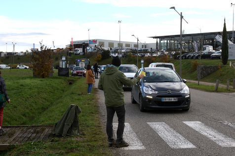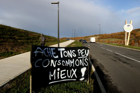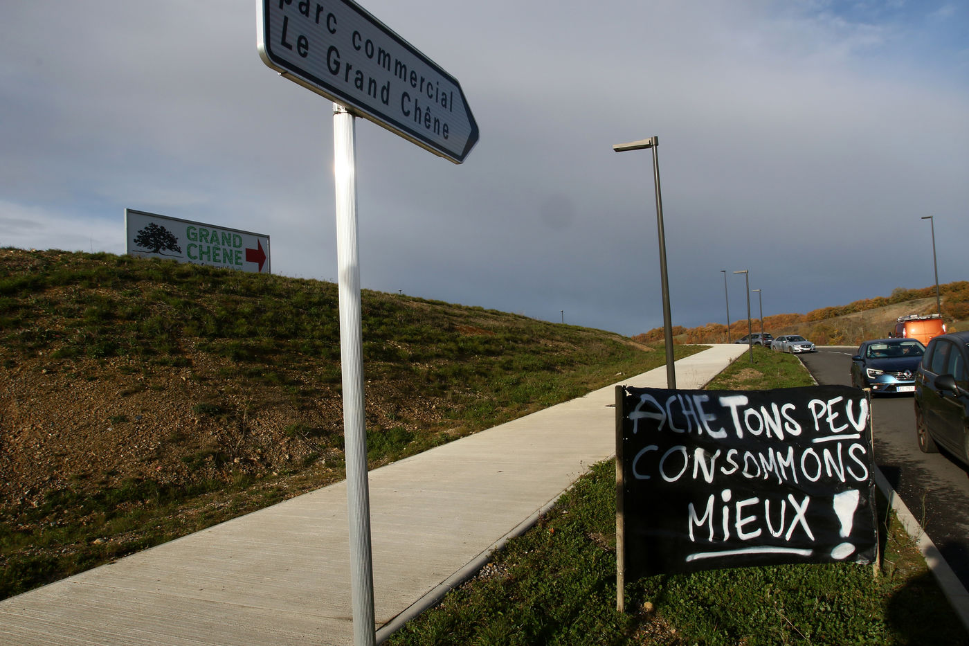 Protest operation of towing of a collective citizen ecologist with consumers to promote better local consumption at the approach of the Grand Chene mall in Auch on Black Friday in order to denounce the overconsumption during this commercial operation of brands with promotions and discounts of their products causing pollution. Auch, France - December 04, 2020. Photography by Sebastien Lapeyrere
