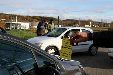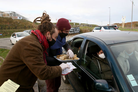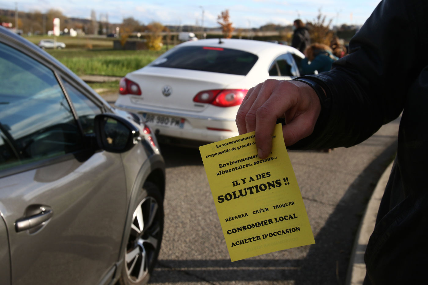 Protestation et tractage d'un collectif citoyens ecologiste aupres des consommateurs pour promouvoir une meilleure consommation locale au abord du centre commercial du Grand Chene a Auch le jour du Black Friday afin de denoncer la surconsommation lors de cette operation commerciale des marques avec des promotions et rabais de leur produits engendrant de la pollution. Auch, France - 04 Decembre 2020. Photographie par Sebastien Lapeyrere