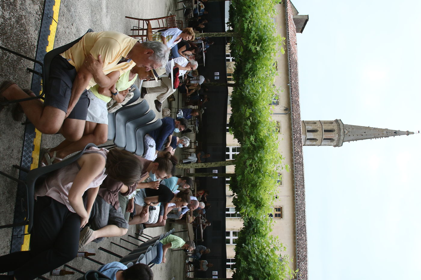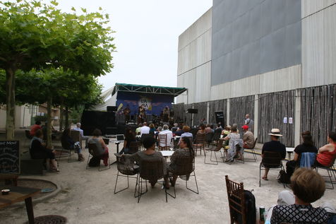 Marciac, France, 2021-07-27. Festivaliers autour de la place principale assistent au Festival off sur la place village de Marciac.