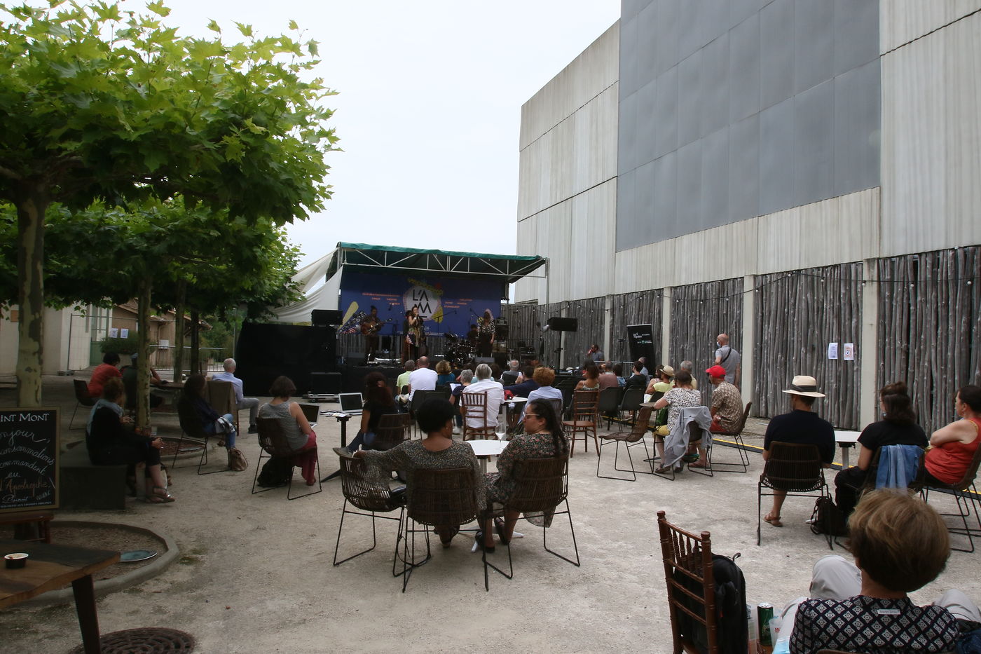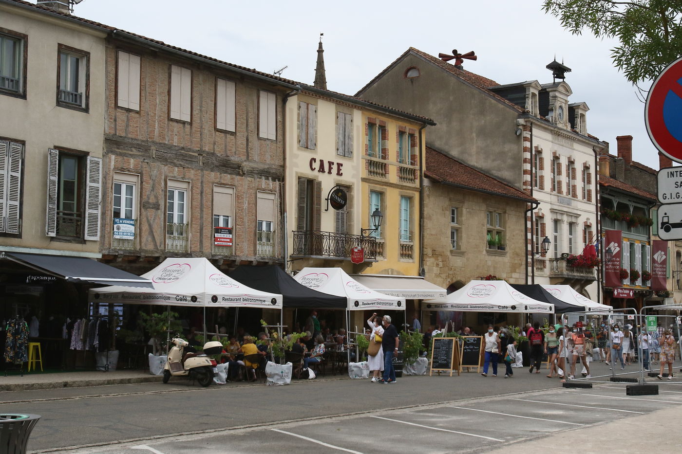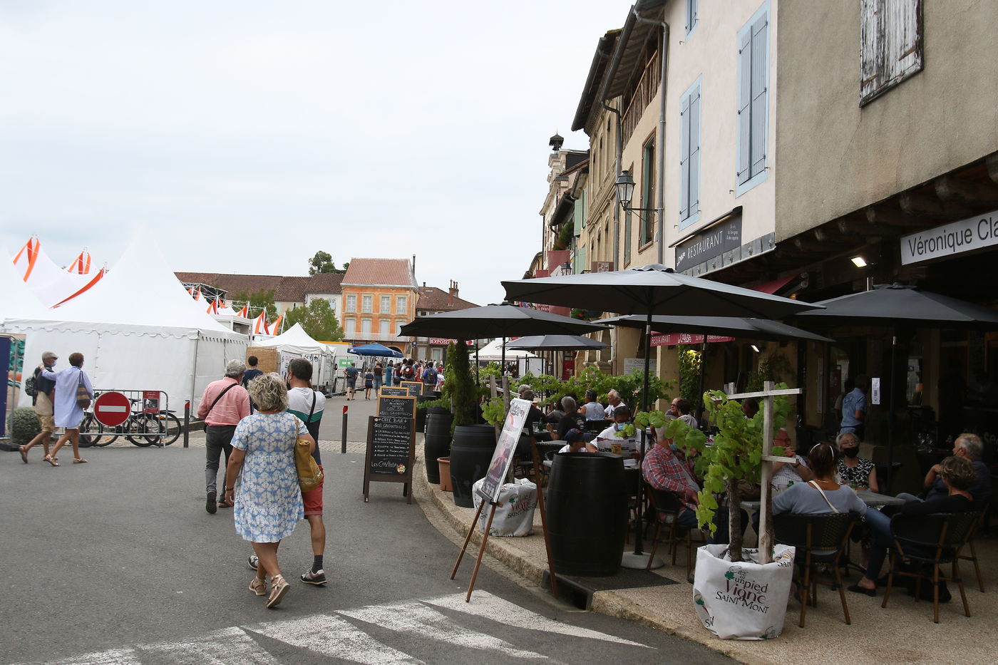 Marciac, France, 2021-07-27. Festival-goers around the main square attend the Festival off in the village square of Marciac.