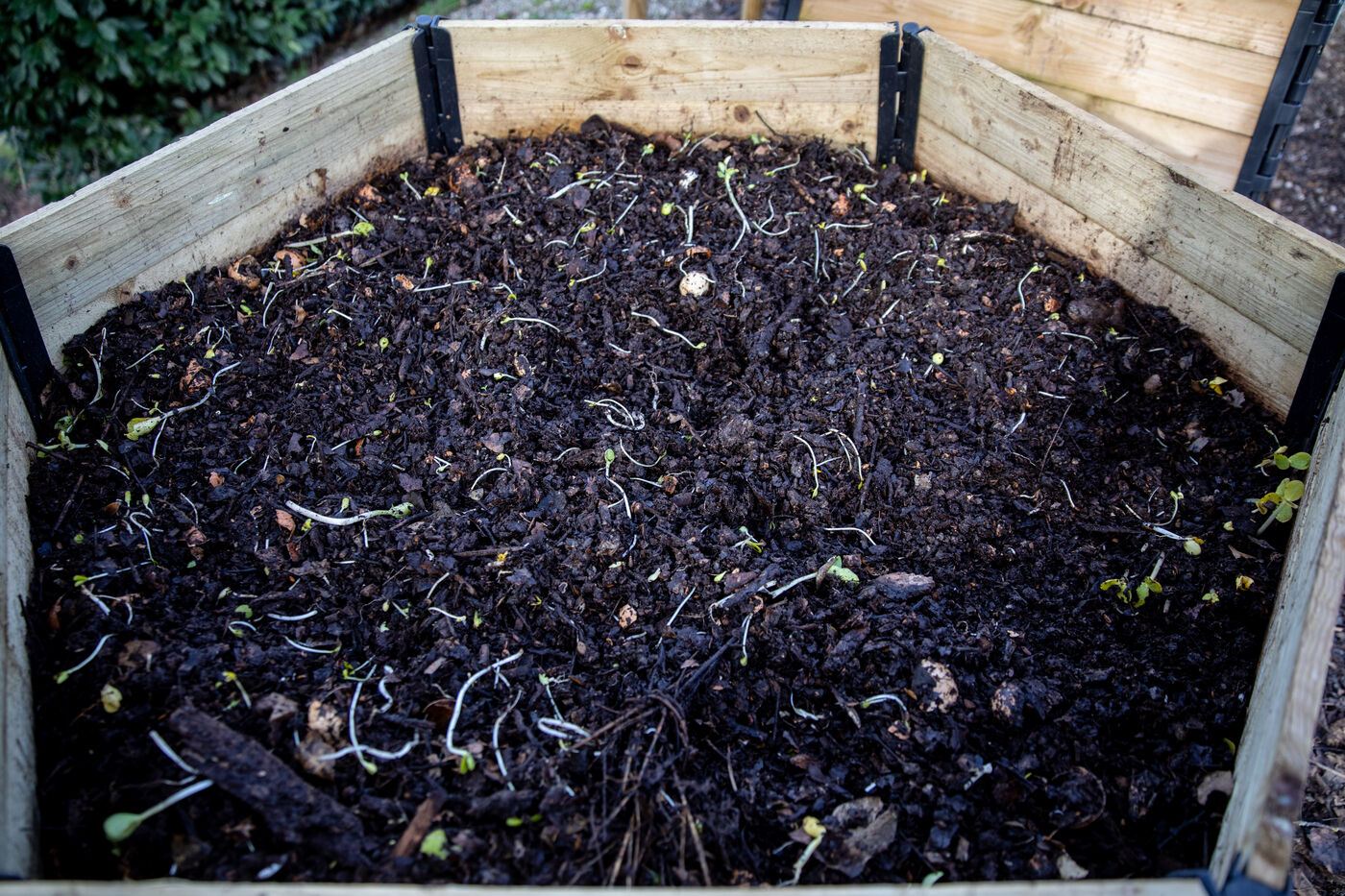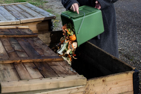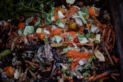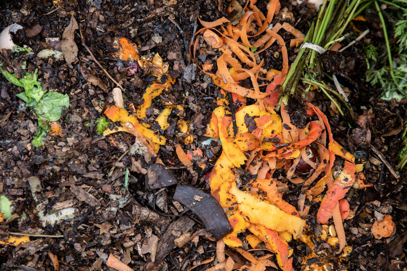 Organic waste consisting of carrot peels, banana peels or eggshells and other food waste deposited in one of the composters at the Terraube collective composting area.