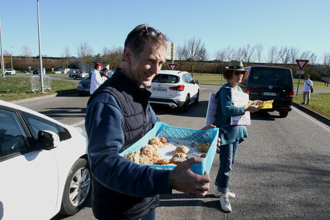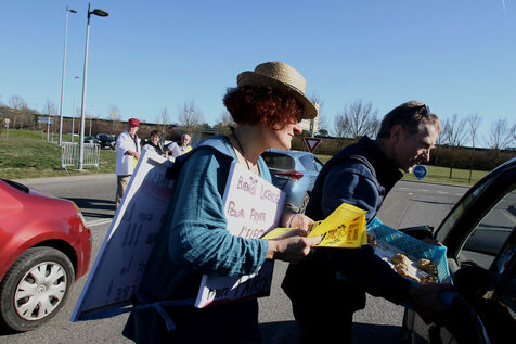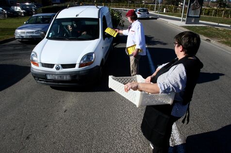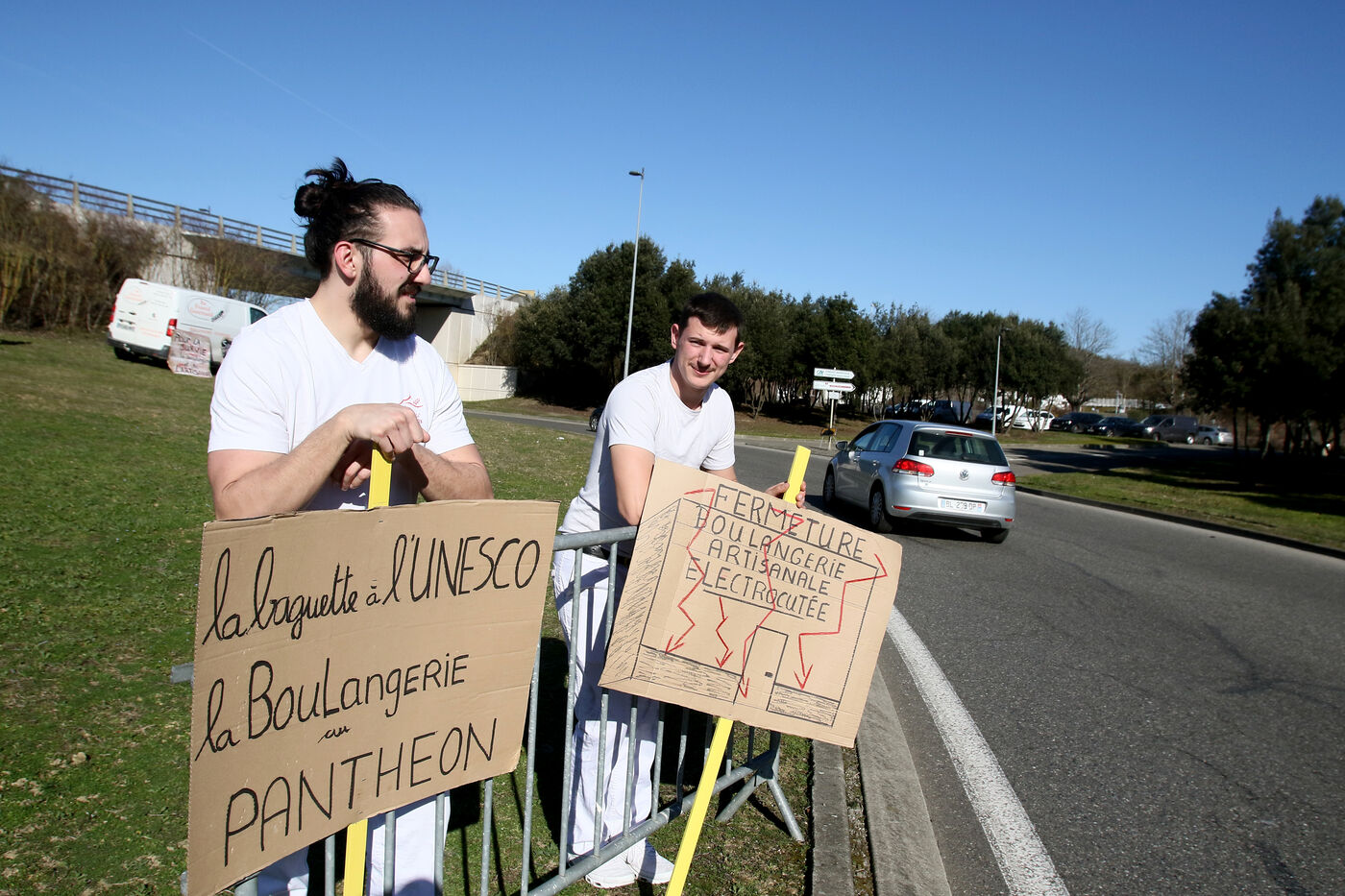 Artisans boulangers et bouchers du Gers lors d'une opération de distribution de tracts à des automobilistes à un rond point d'Auch afin de les informer de la hausse de leurs charges du à l'inflation sur les matières premières et surtout des prix de l'énergie avec des factures d'élèctricite et de gaz mettant en péril leurs entreprises artisanales
