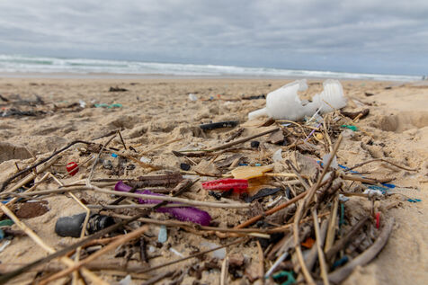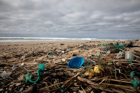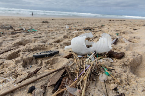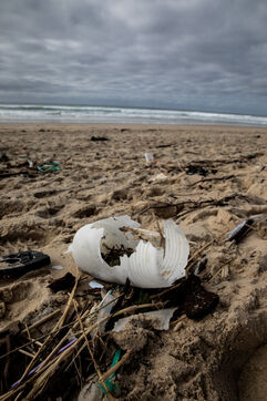 Mimizan plage, France, 2024-02-19. Dozens of pieces of plastic waste washed up by the ocean on a beach at Mimizan Plage. Plastic pollution from human waste affects the entire marine ecosystem and oceans. Photography by Sebastien Lapeyrere.