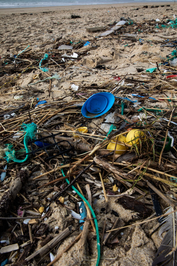Mimizan plage, France, 2024-02-19. Des dizaines de morceaux de dechets en plastique a ete rejete par l ocean sur une plage de Mimizan Plage. La pollution plastique en gendre par les dechets des humains affecte l ensemble de l ecosysteme marins et des oceans. Photographie par Sebastien Lapeyrere.