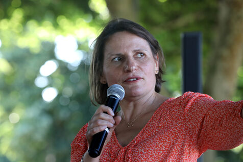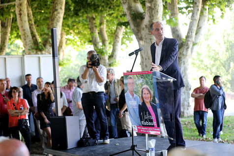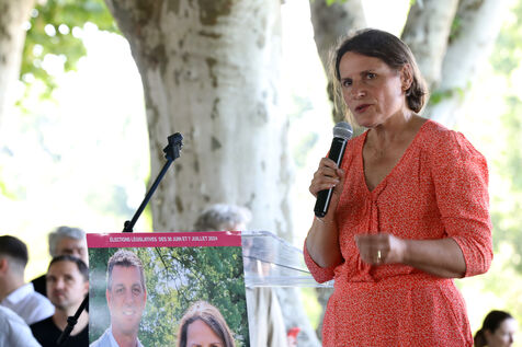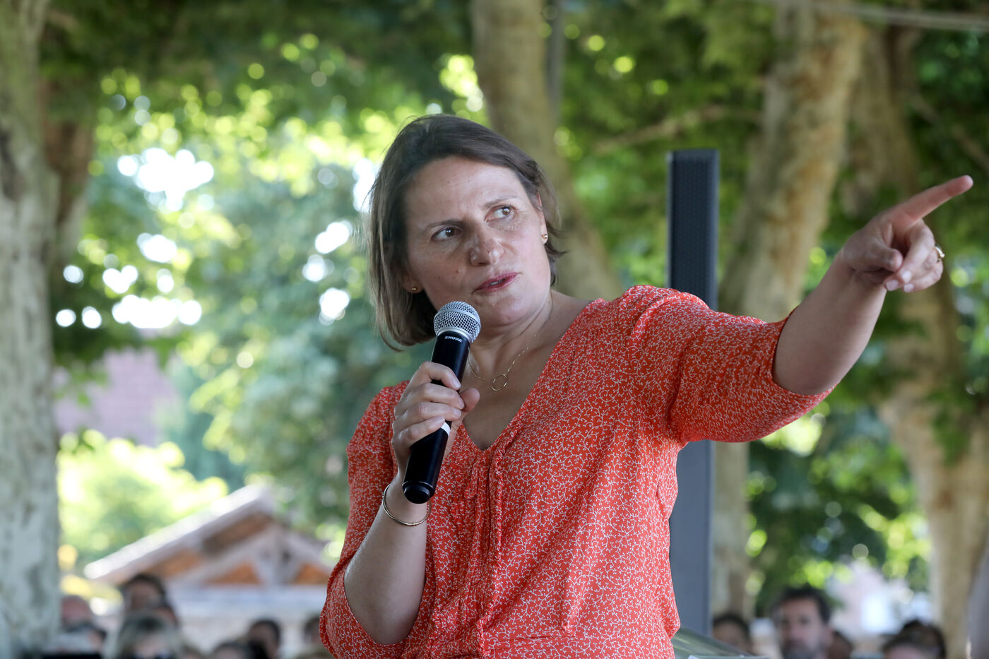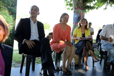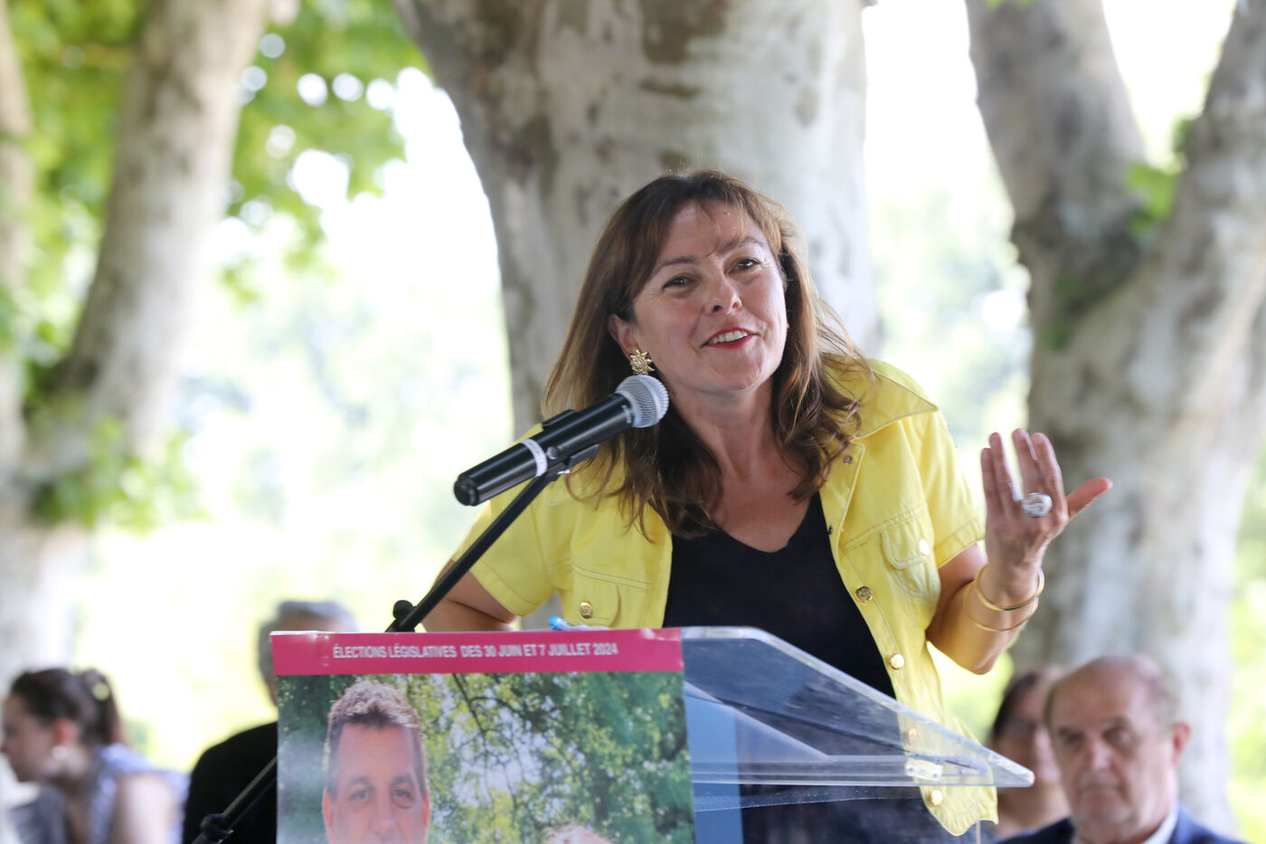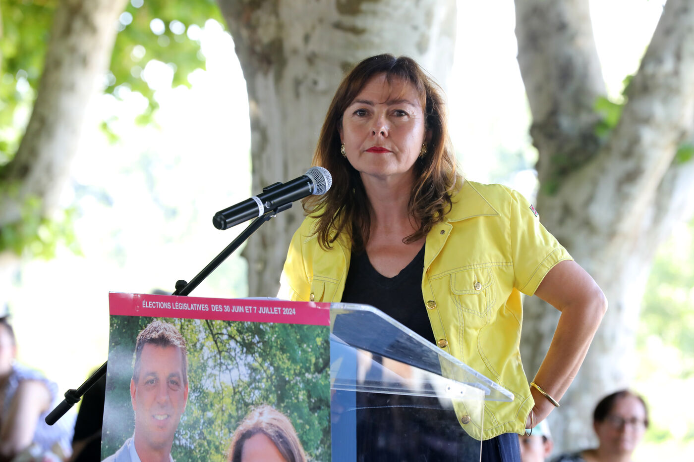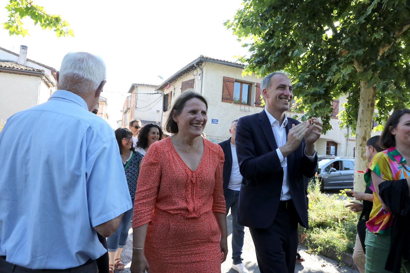 Negreplisse, France, 2024-06-24. Valerie Rabault ( Pink dress ) outgoing deputy (PS - Nouveau Front de Gauche) for the 1st constituency of Tarn-et-Garonne accompanied by Raphael Glucksmann European deputy at a meeting of Valerie Rabault in her constituency for the 2024 early legislative elections in Negreplisse . Photography by Sebastien Lapeyrere.
