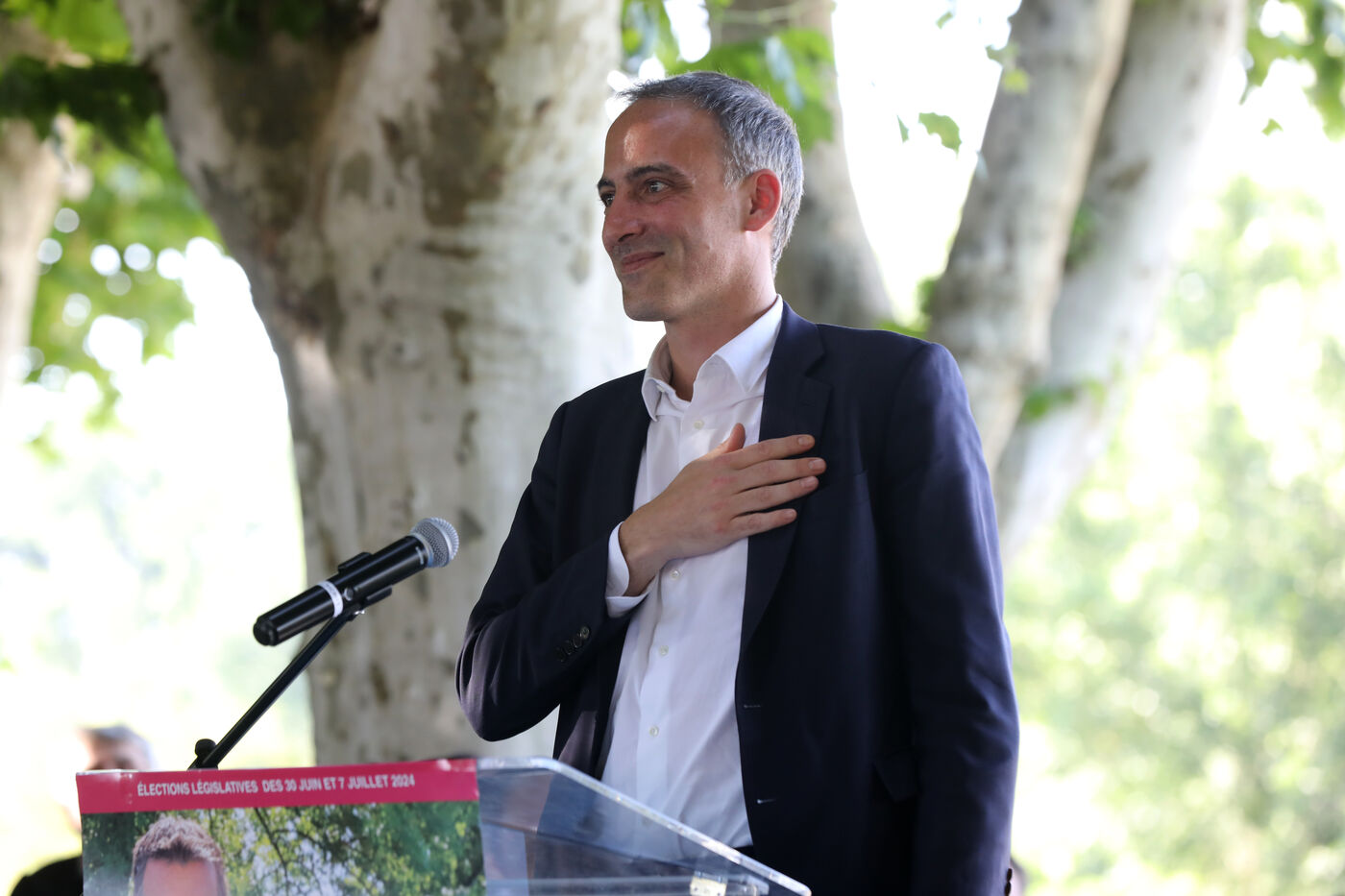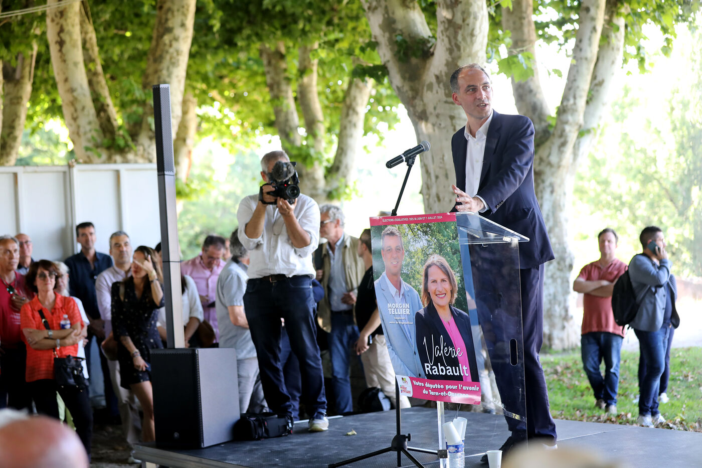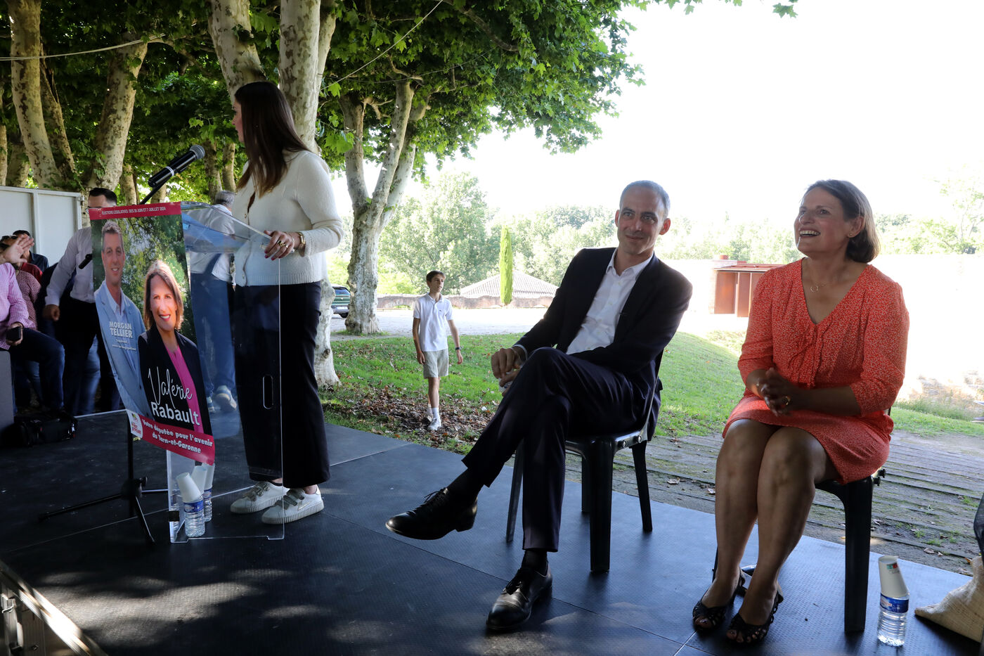 Negreplisse, France, 2024-06-24. Valérie Rabault député sortante (PS - Nouveau Front de Gauche) de la 1ere circonscription du Tarn-et-Garonne accompagné par Raphael Glucksmann député europeen lors d'un meeting de Valérie Rabault dans sa circonscription pour les élections législatives anticipée de 2024 à Negreplisse . Photographie par Sébastien Lapeyrère.