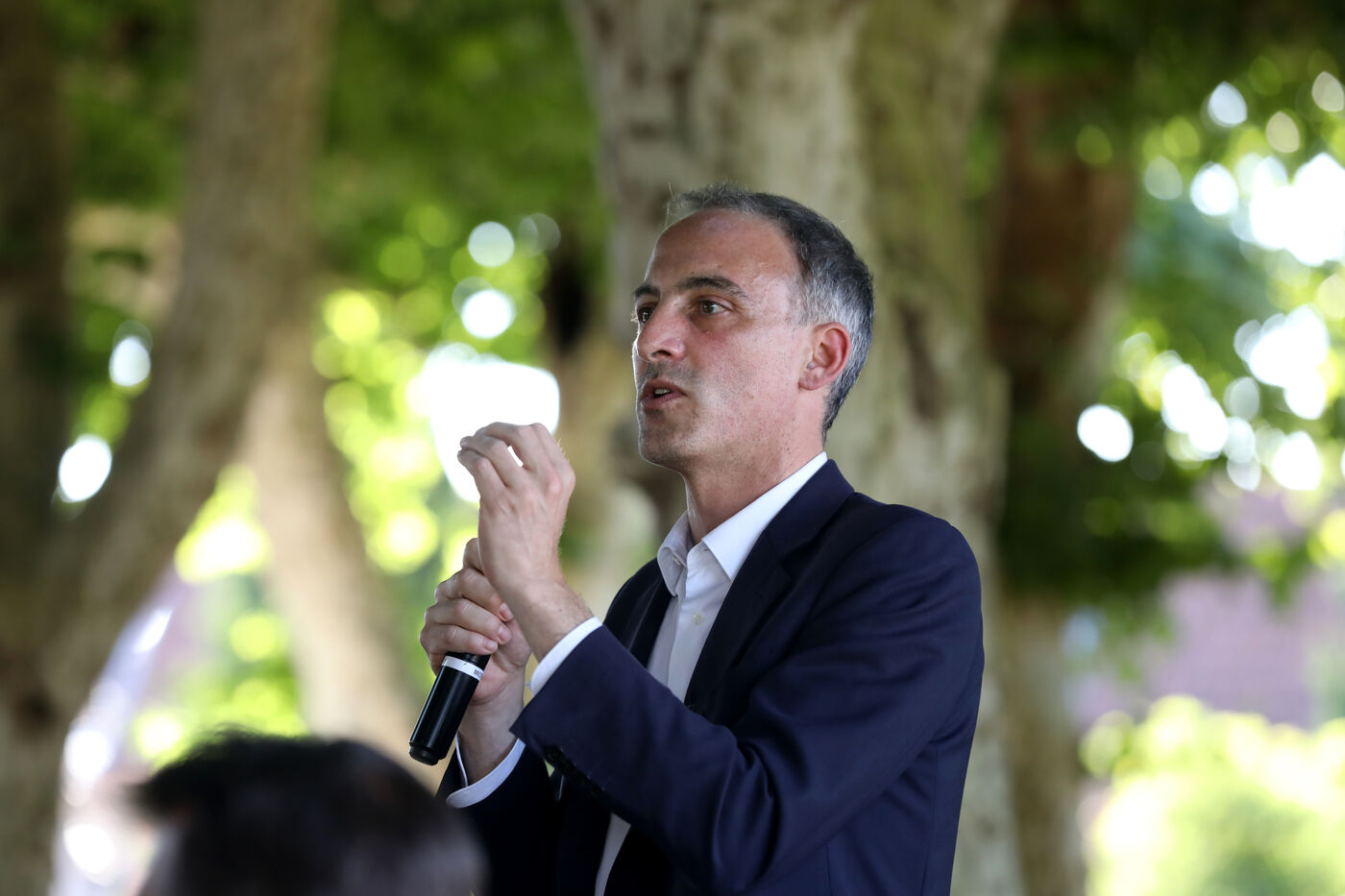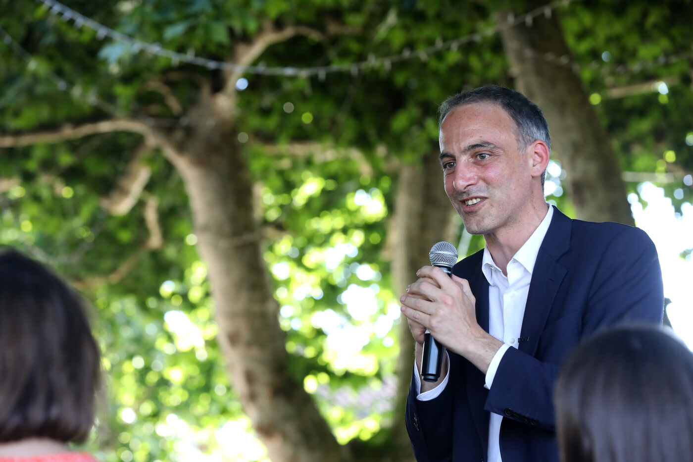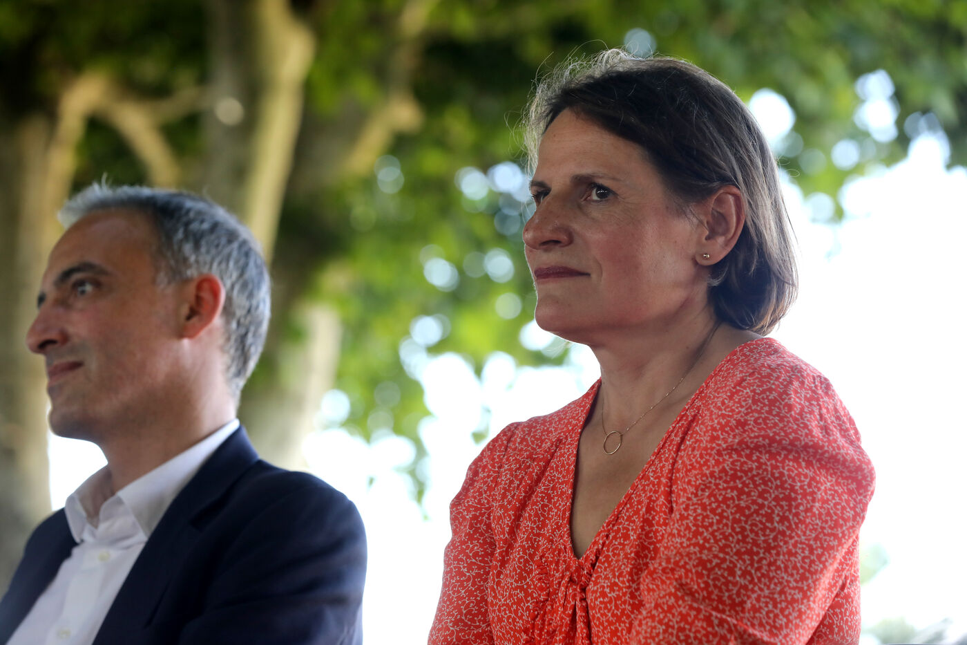 Negreplisse, France, 2024-06-24. Valérie Rabault député sortante (PS - Nouveau Front de Gauche) de la 1ere circonscription du Tarn-et-Garonne accompagné par Raphael Glucksmann député europeen lors d'un meeting de Valérie Rabault dans sa circonscription pour les élections législatives anticipée de 2024 à Negreplisse . Photographie par Sébastien Lapeyrère.