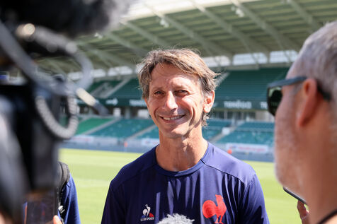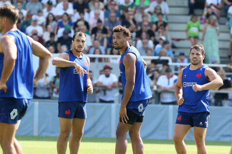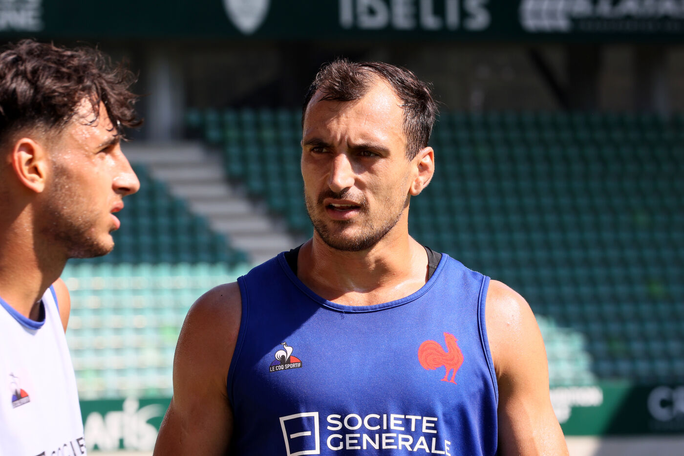 Pau, France, 2024-07-11. Séance d'entraînement au stade du Hameau à Pau pour les joueurs de l' équipe de France de rugby à 7 lors du stage de préparation avant les Jeux olympiques de Paris 2024 .Photographie par Sebastien Lapeyrere.