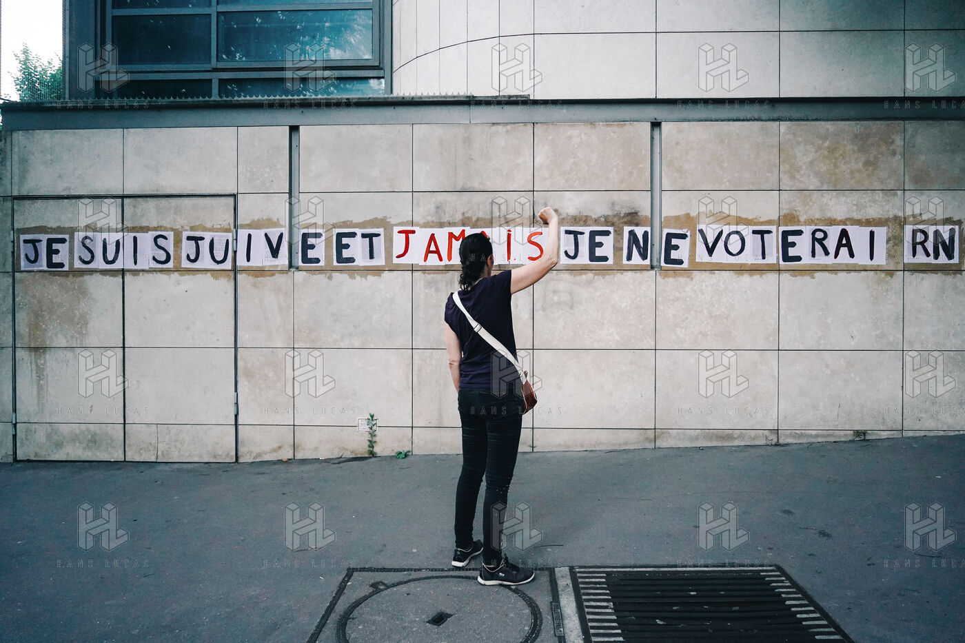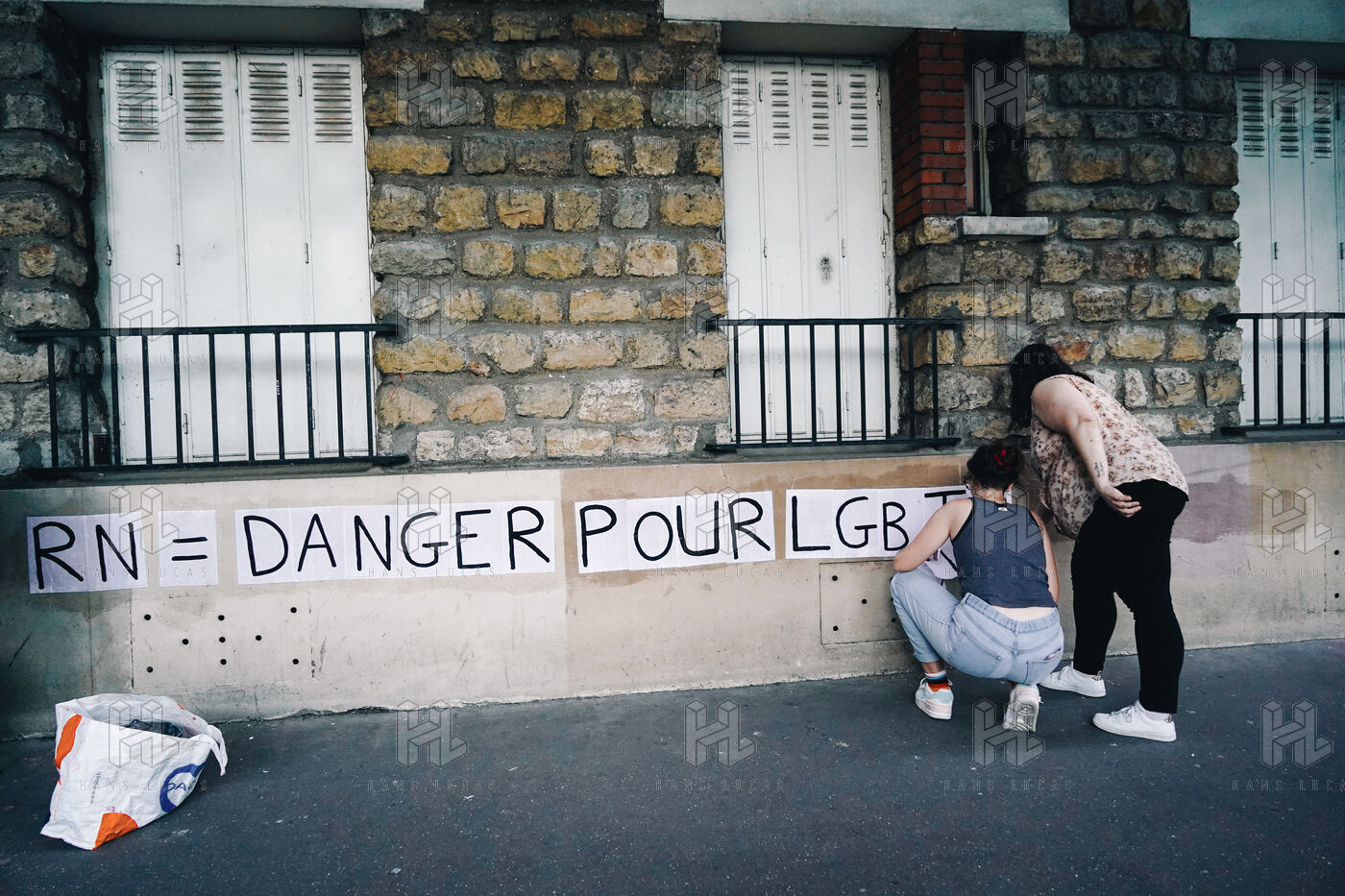 A few days before the legislative elections on 30 June 2024, activists from the feminist collective Nous Toutes distributed leaflets at the metro exit. In the evening, they put up collages in the 12th arrondissement of Paris. This action aimed to support the New Popular Front (Nouveau Front populaire), a coalition recently formed to oppose the RN and the presidential majority parties.