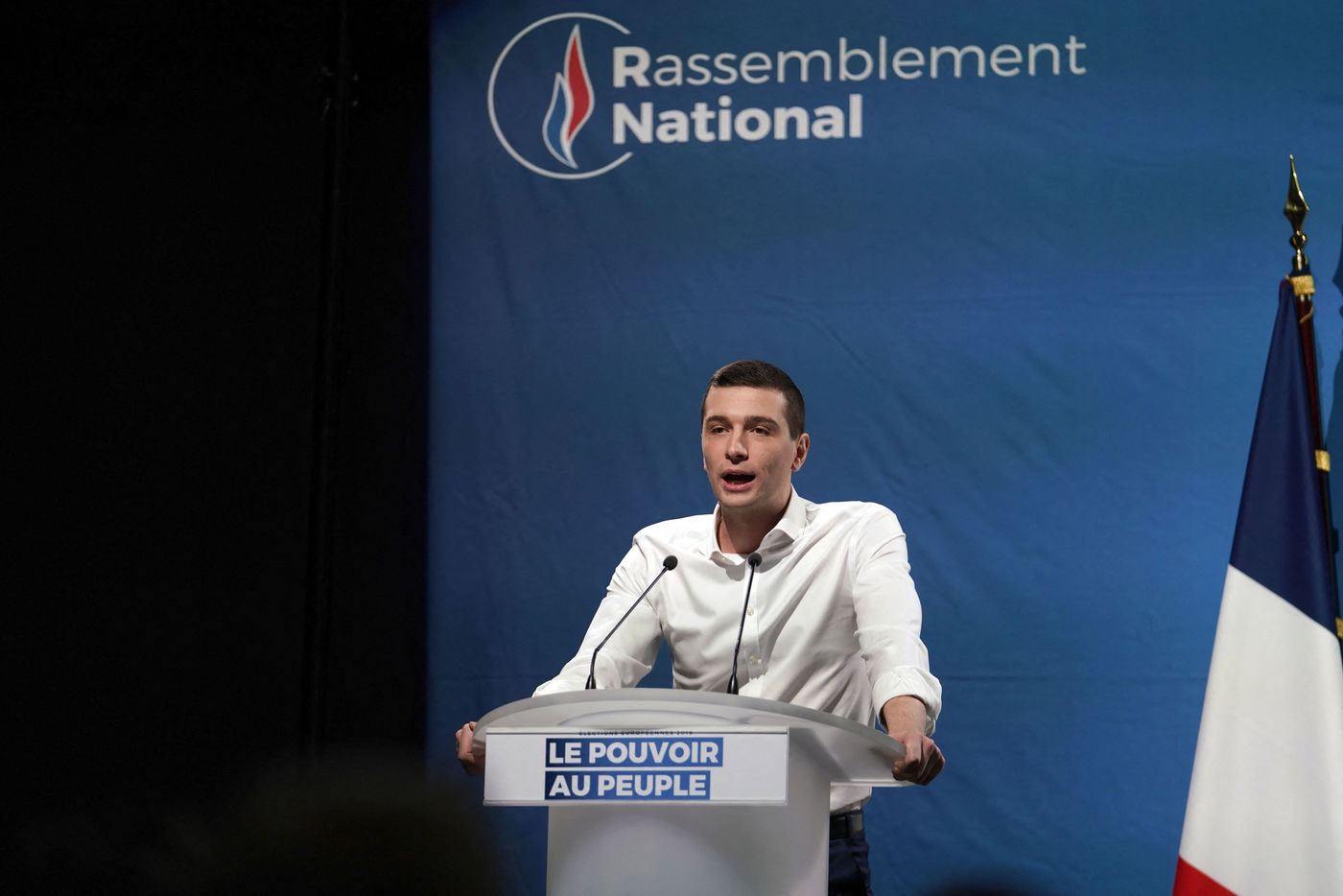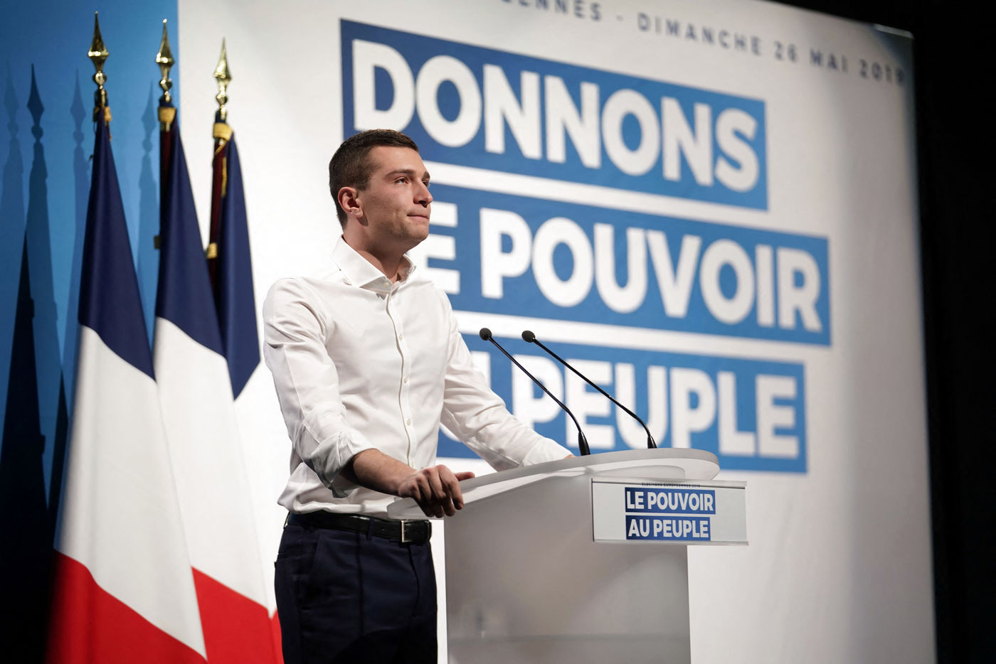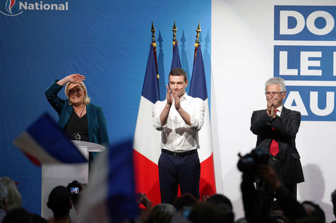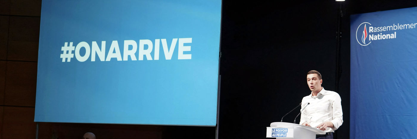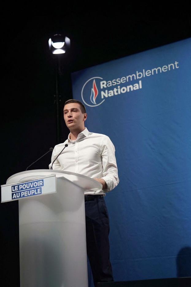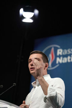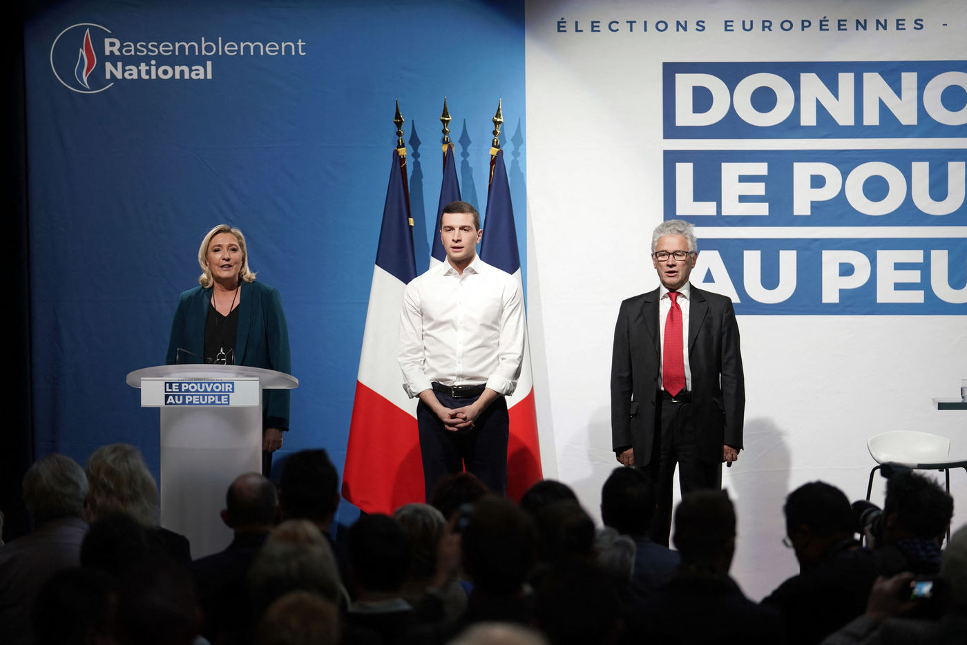 National Rally (RN), french far-right party of Marine Le Pen, meeting in Caudry (Northern France) with Marine Le Pen, Jordan Bardella, head of list, and Herve Juvin, candidate, for European Elections