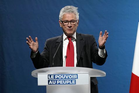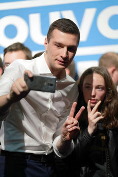 Meeting du RN en presence de Jordan Bardella, tete de liste pour le RN aux elections europeennes de 2019, et Herve Juvin, candidat, dans la salle des fetes de Caudry dans le Nord de la France, le 24 Fevrier 2019.