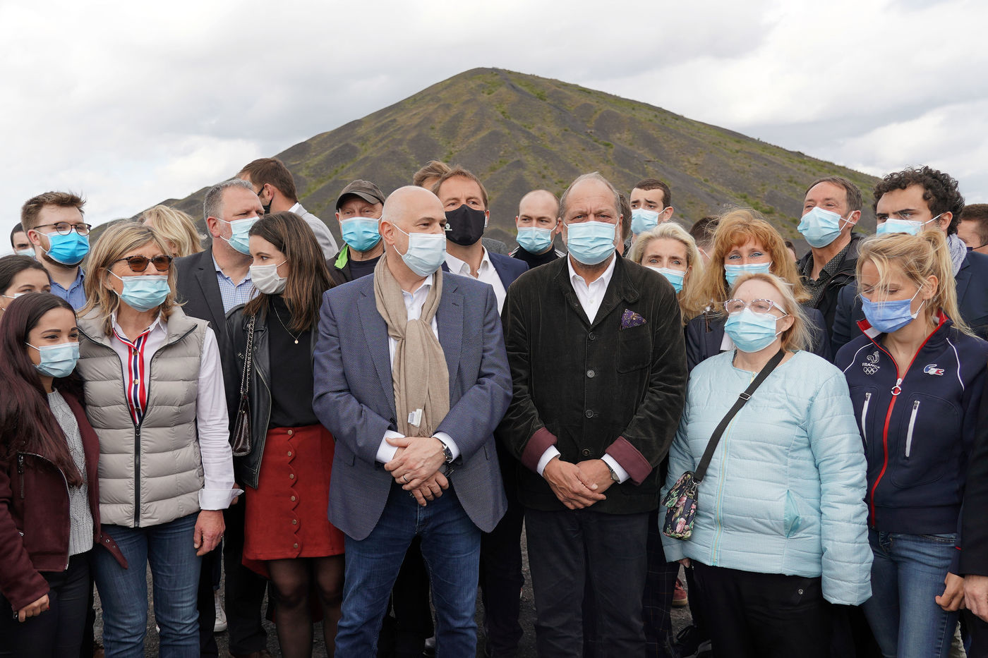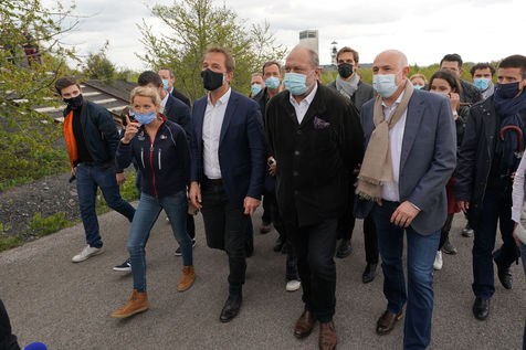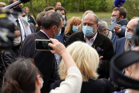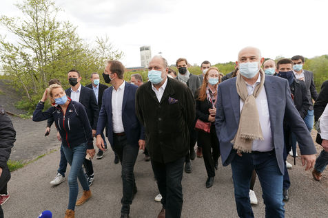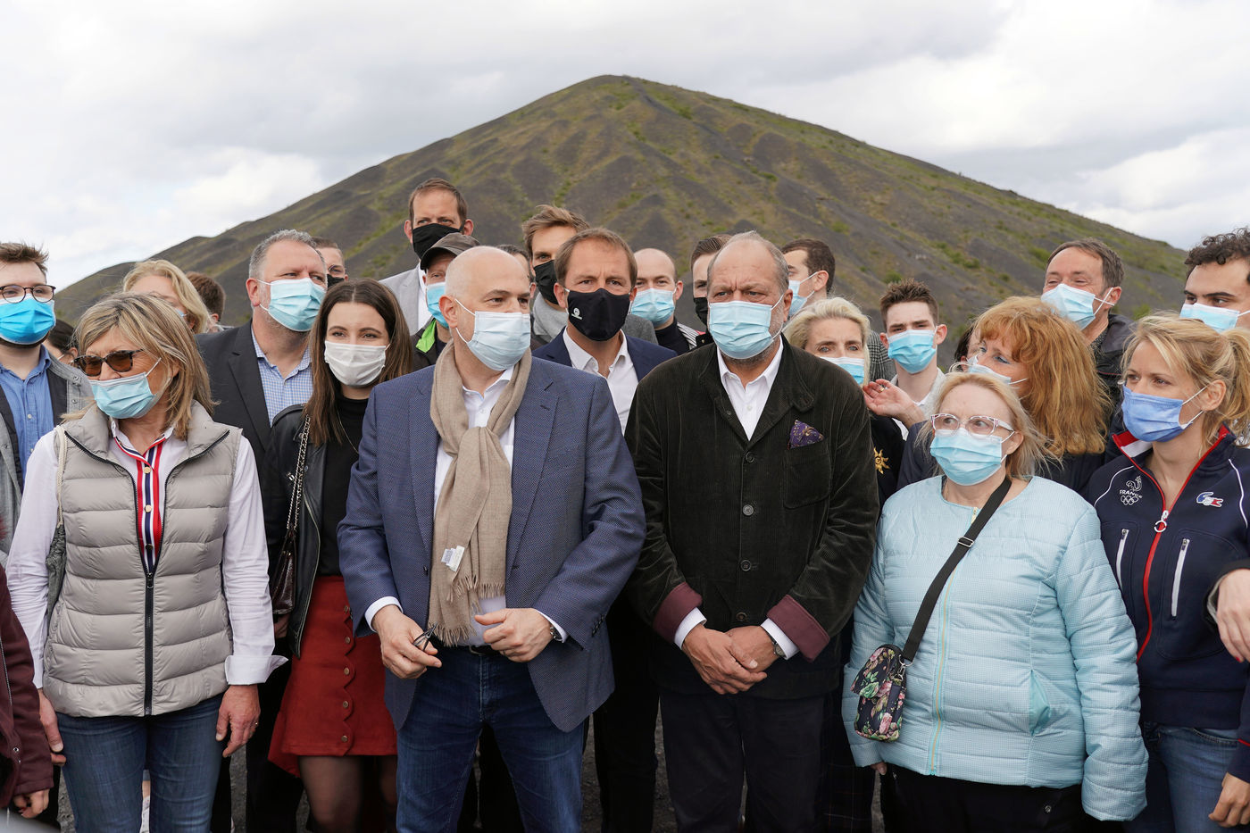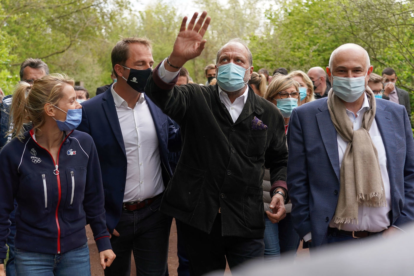 Eric Dupond-Moretti (LREM) campaigns in Loos-en-Gohelle, near Lens, Pas-de-Calais, France for upcoming regional election with head of list Laurent Pietraszewski, Thibaut Guilluy and Tiphaine Auziere (Brigitte Macron's daughter) on May 08, 2021.