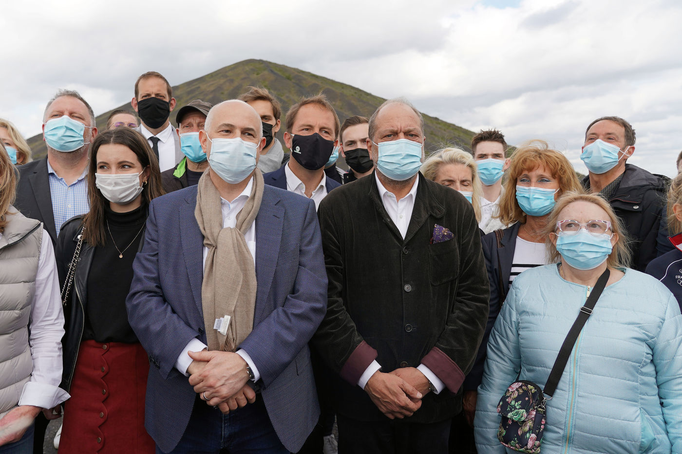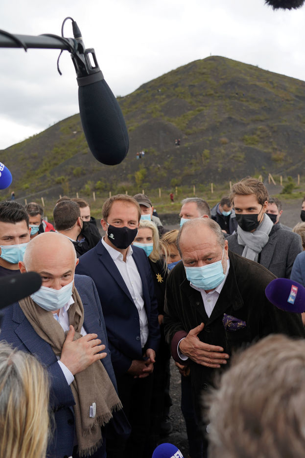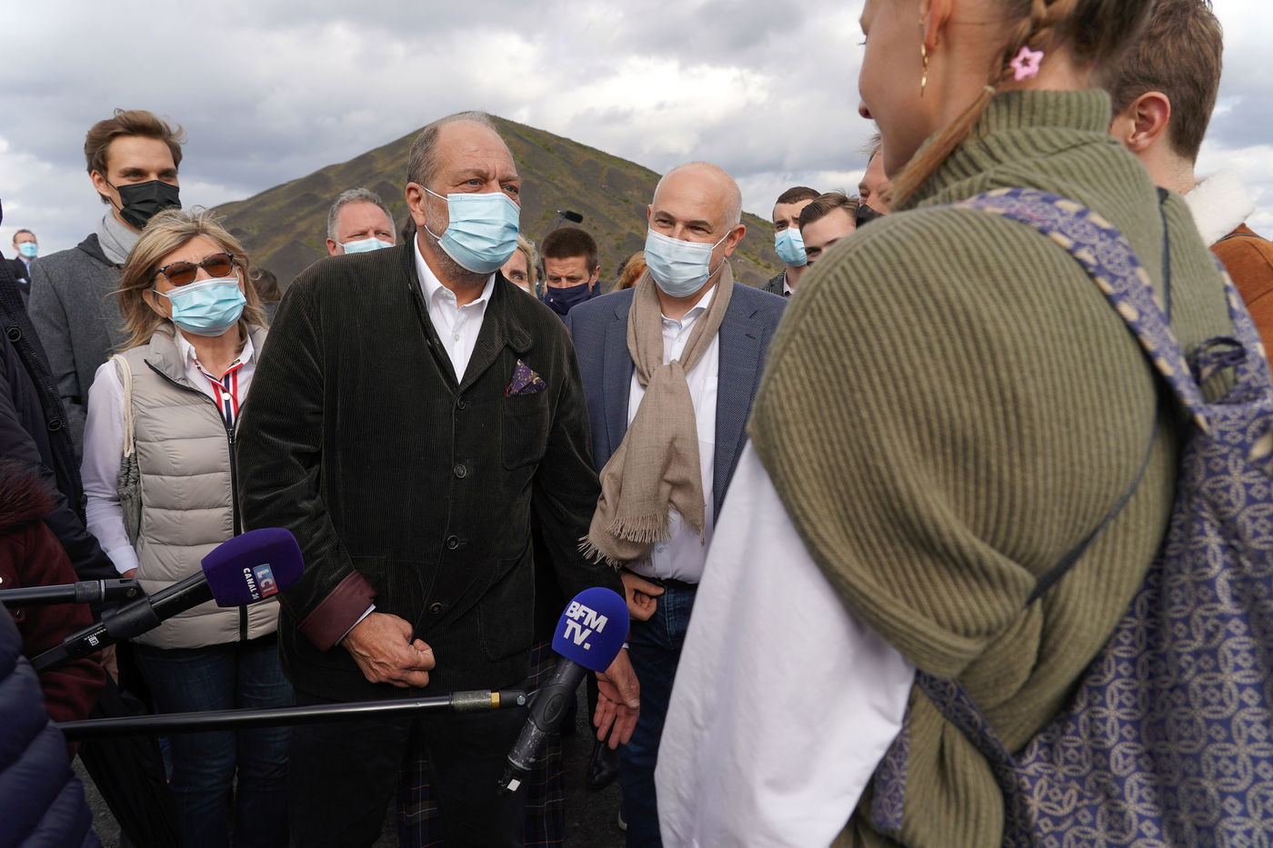 Eric Dupond-Moretti (LREM) en campagne a Loos-en-Gohelle, pres de Lens, Pas-de-Calais, France pour les prochaines elections regionales avec la tete de liste Laurent Pietraszewski, Thibaut Guilluy et Tiphaine Auziere (fille de Brigitte Macron) le 08 Mai 2021