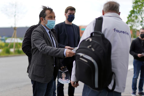 Sebastien Chenu (RN) en campagne pour les elections regionales tracte a la sortie d'une usine a Henon-Beaumont, France, le 21 Mai 2021