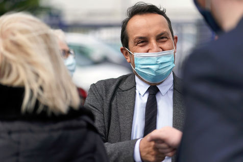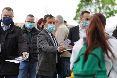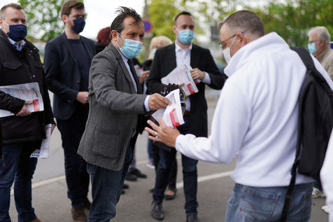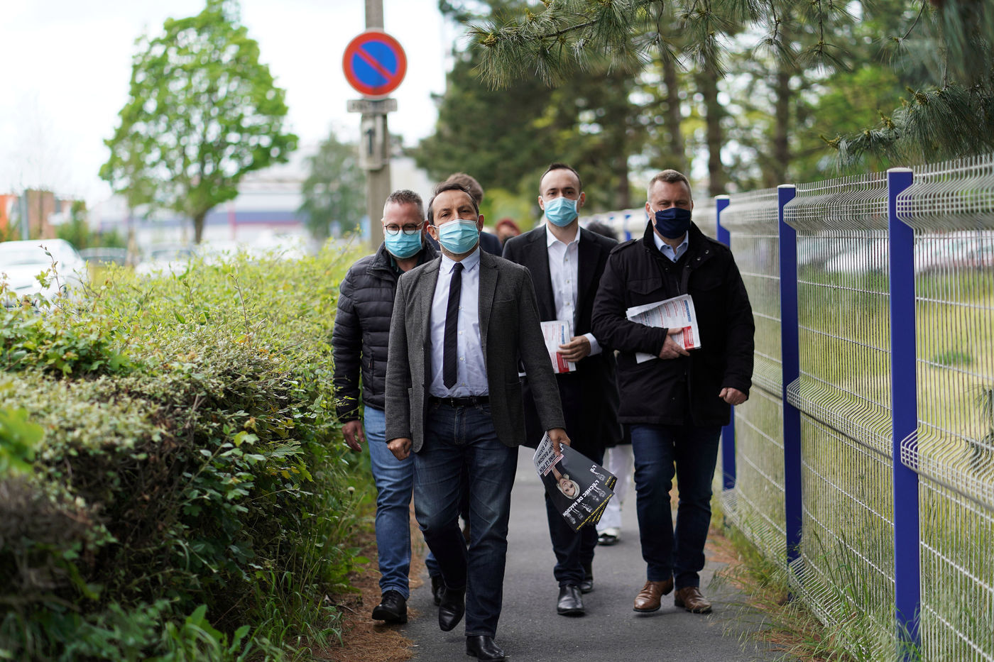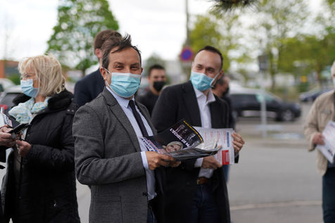 Far right party Rassemblement National (National Rally) candidate for upcoming regional election in northern France, Sebastien Chenu, campaigns in Henon-Beaumont, France, on May 21, 2021.