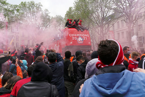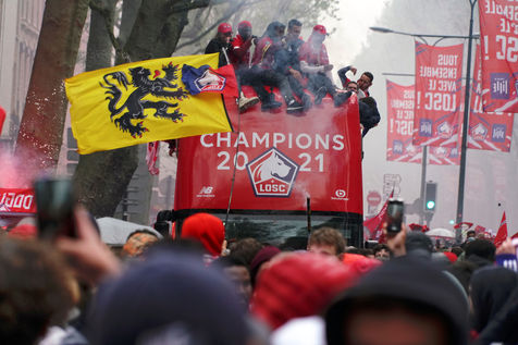 Ambiance in the streets of Lille as players of Lille OSC parade on a bus with the L1 championship trophy to celebrate winning League with fans on May 24, 2021 in Lille, France.