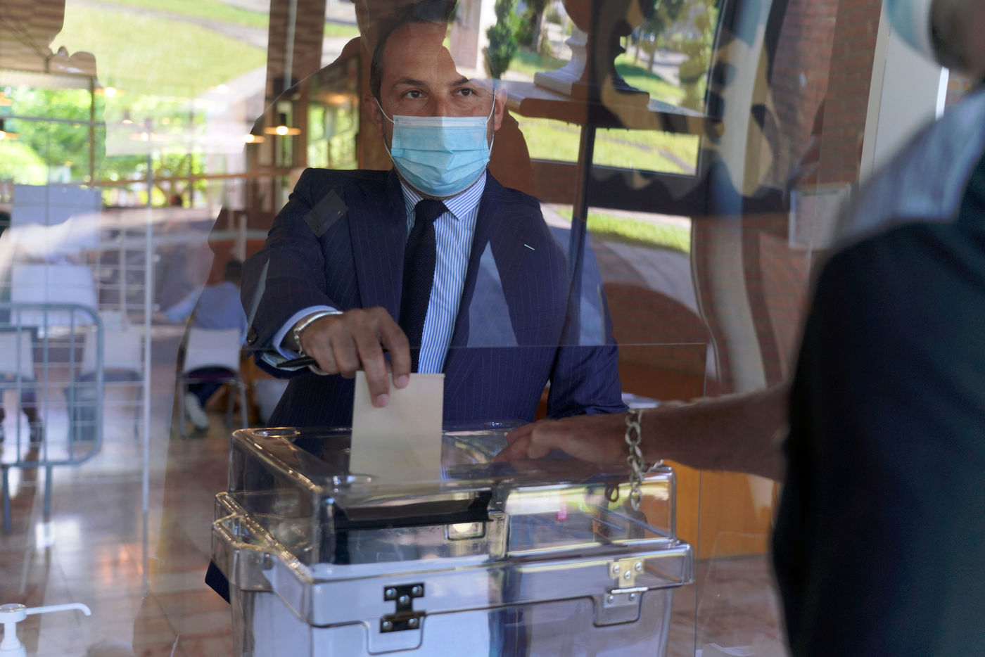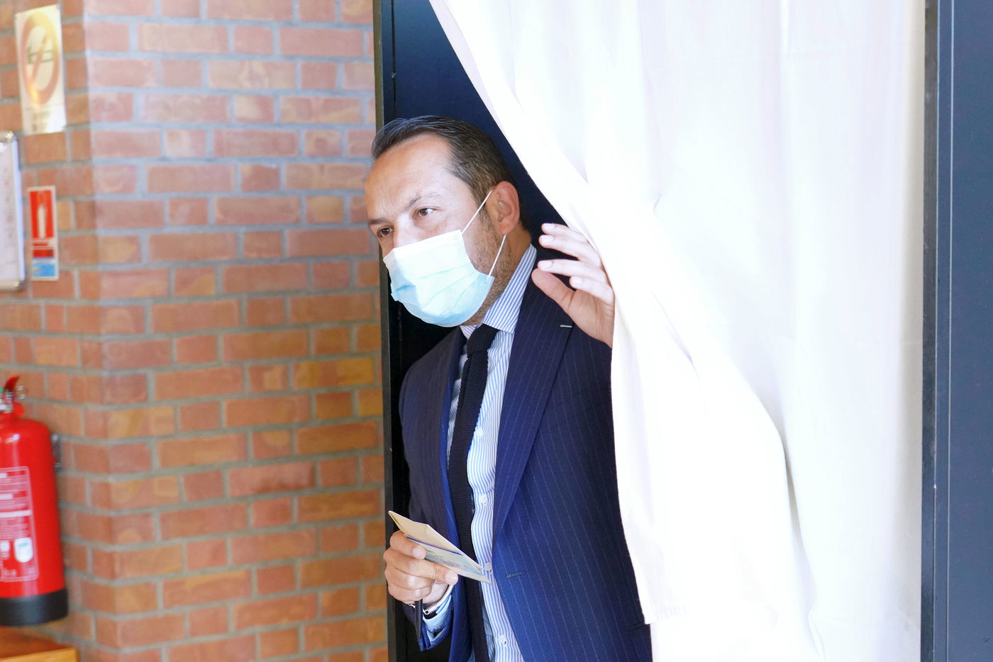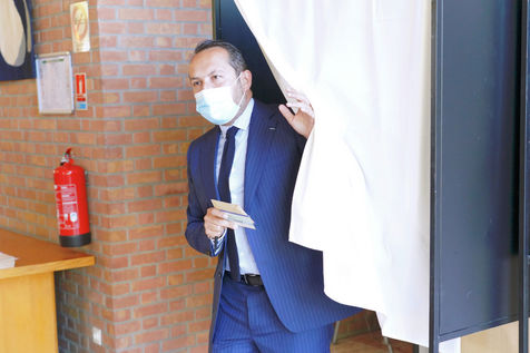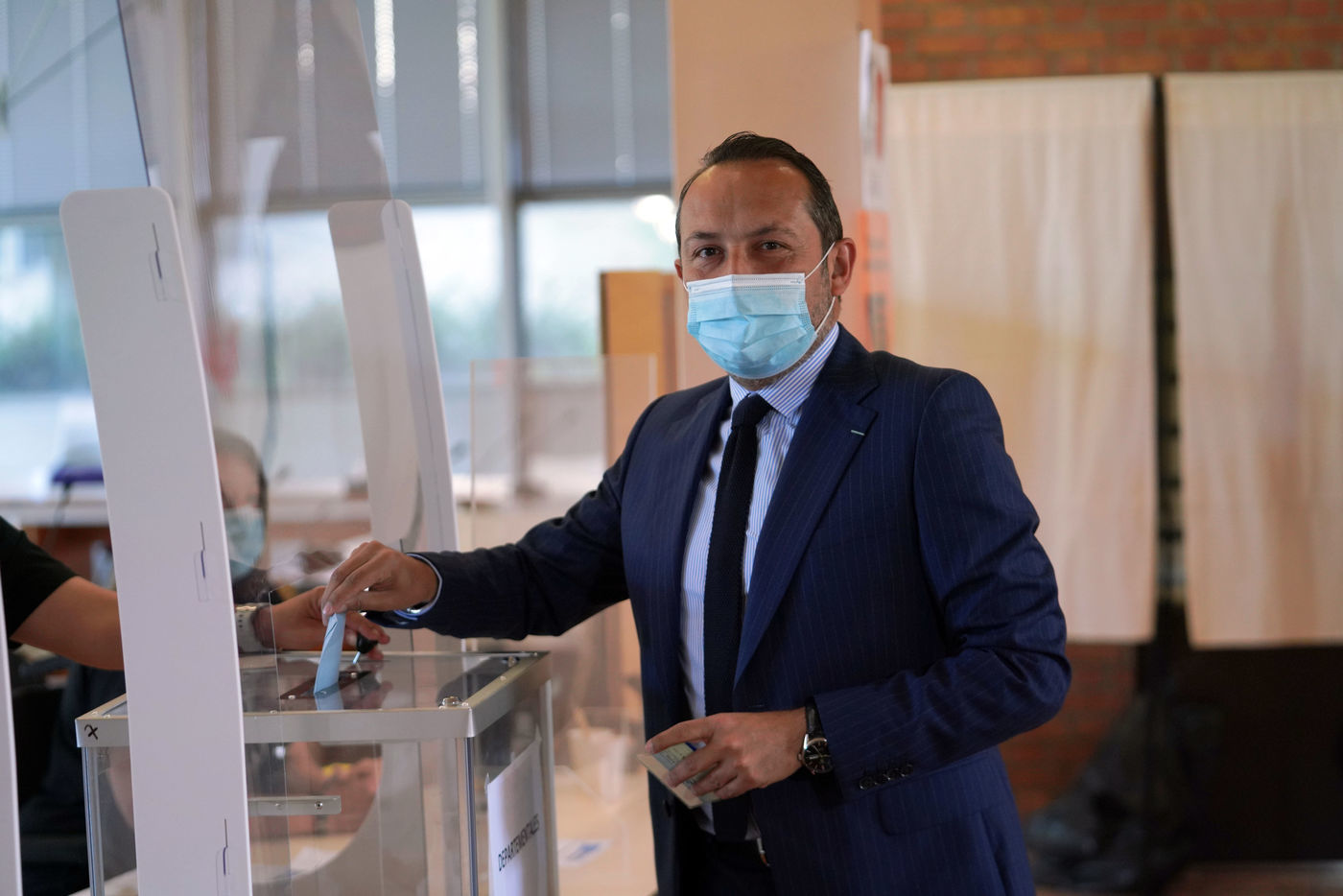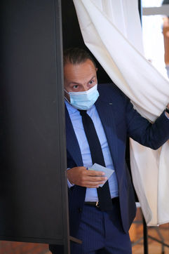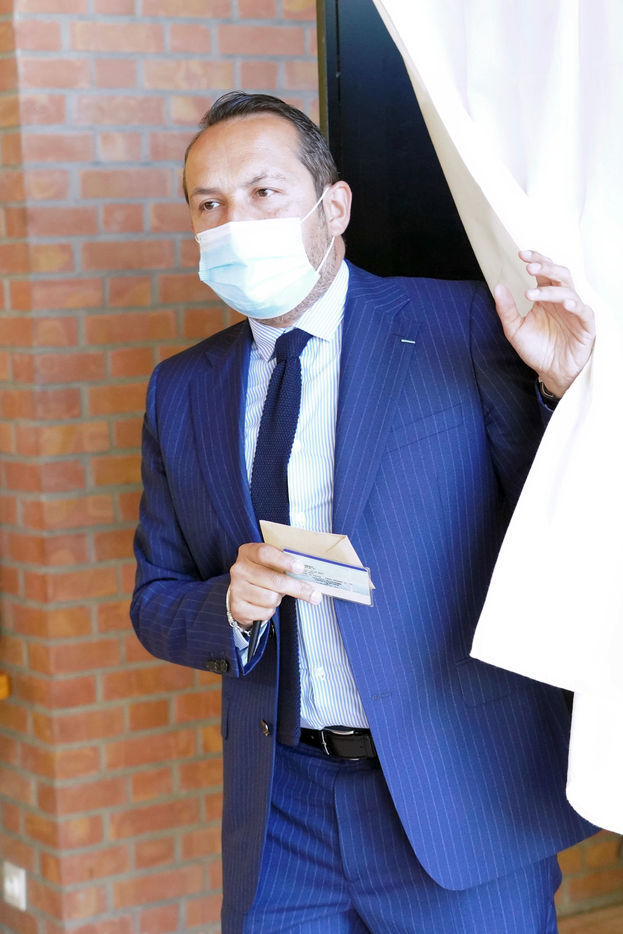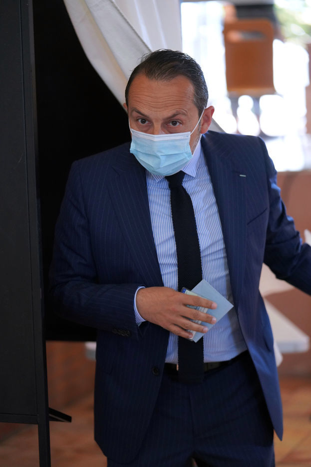 Sebastien Chenu, tete de liste pour les elections regionales dans les Hauts-de-France, vote pour le 1er tour des elections regionales et cantonales a Denain, Nord, le 20 Juin 20201