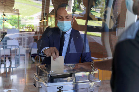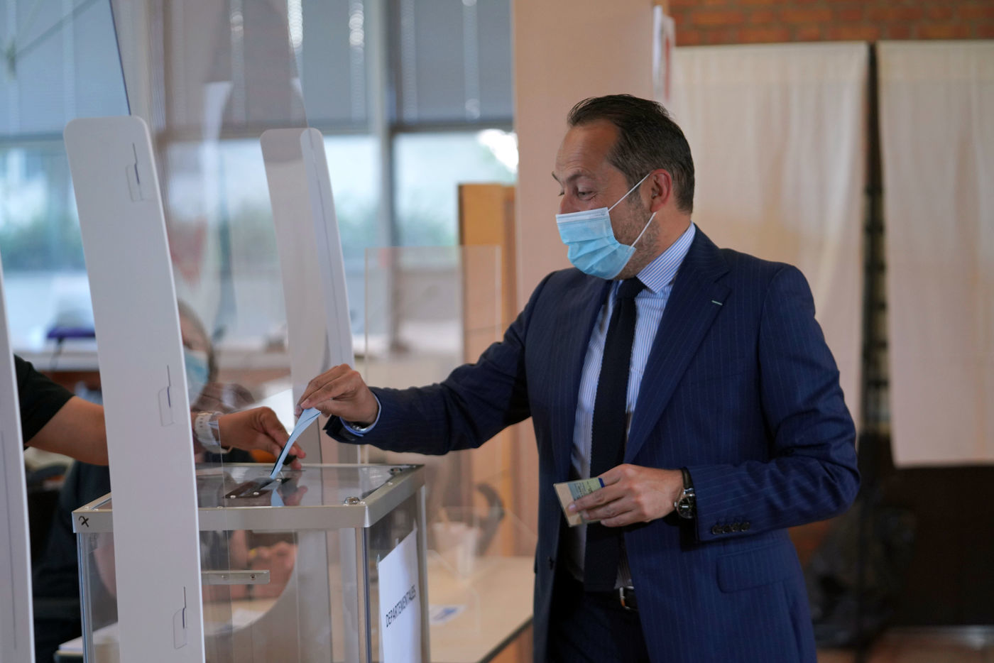 Head of list for far right party Rassemblement National (National Rally) Sebastien Chenu votes for regional elections in Denain, Northern France, on June 20, 2021.