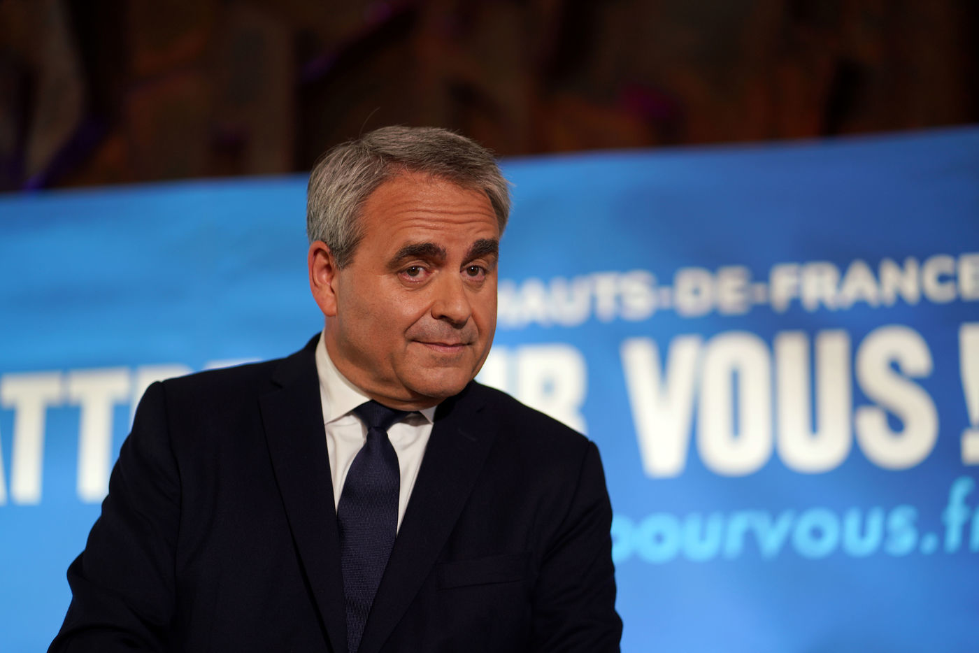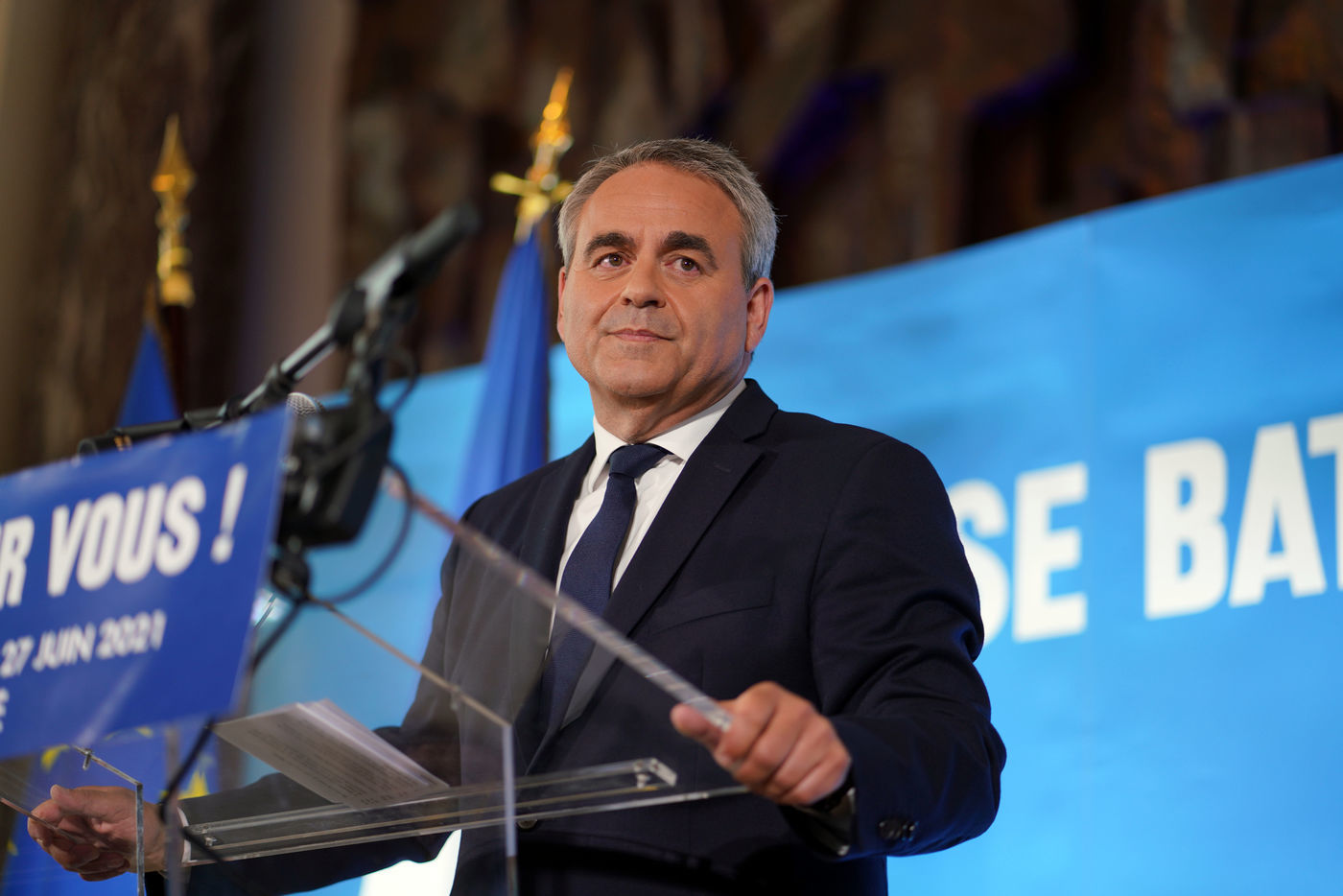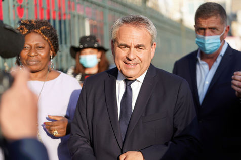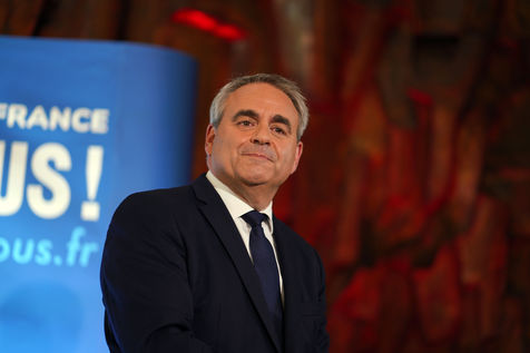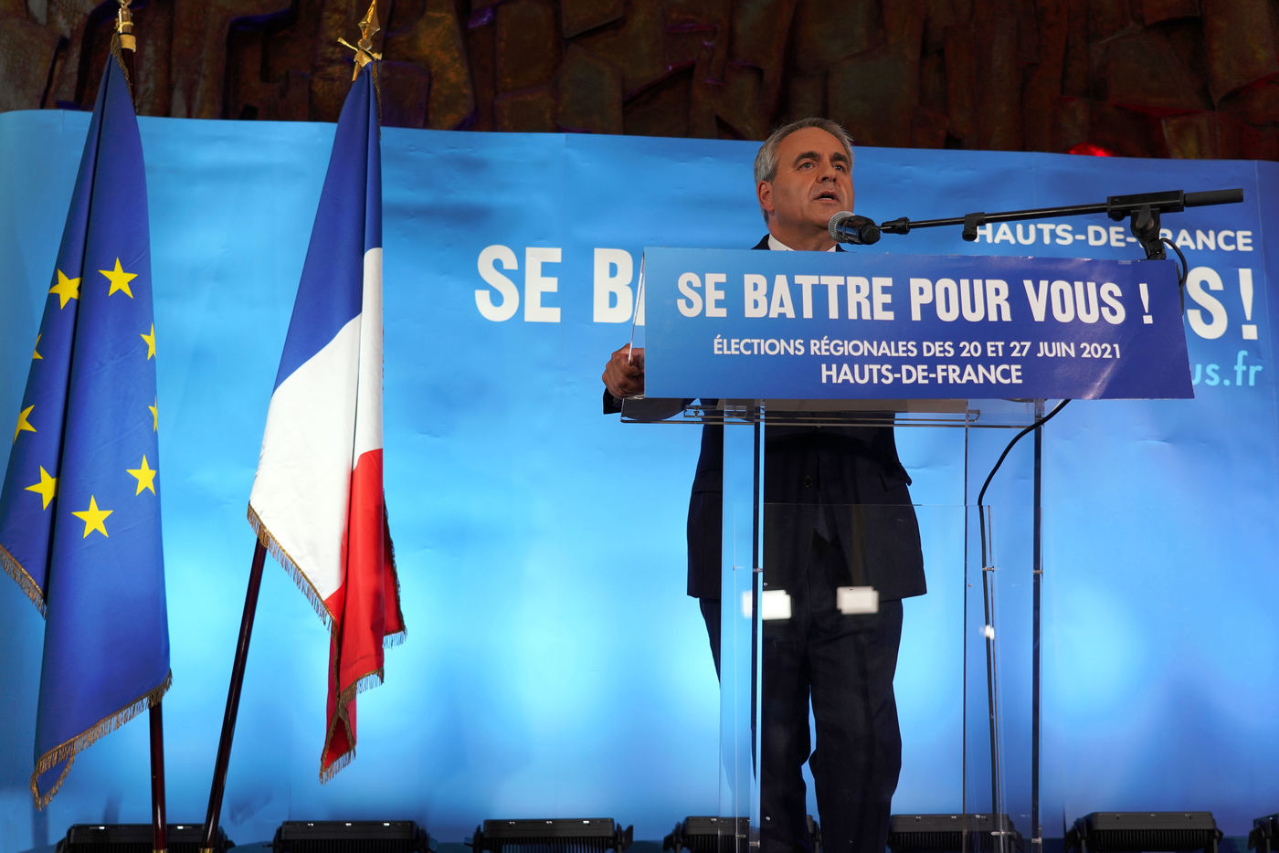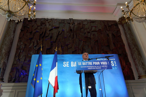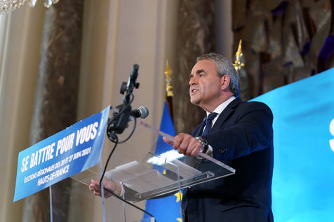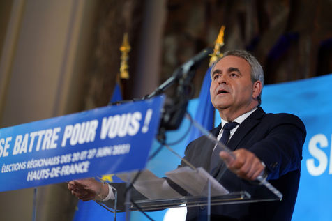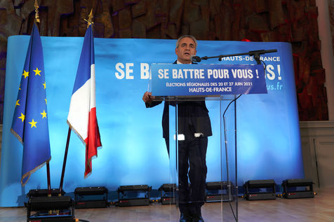 Xavier Bertrand, Les Republicains (LR) conservative party candidate who runs for his succession as Hauts-de-France region president, during electoral night of the second round of French regional and departmental elections, in Saint-Quentin, France, June 27. 2021.