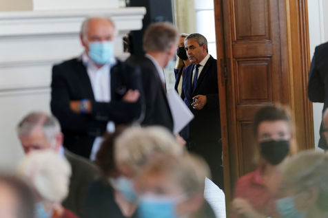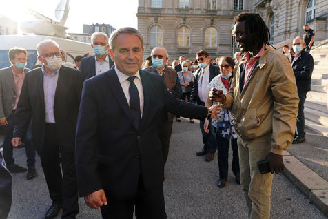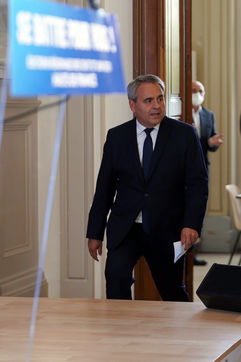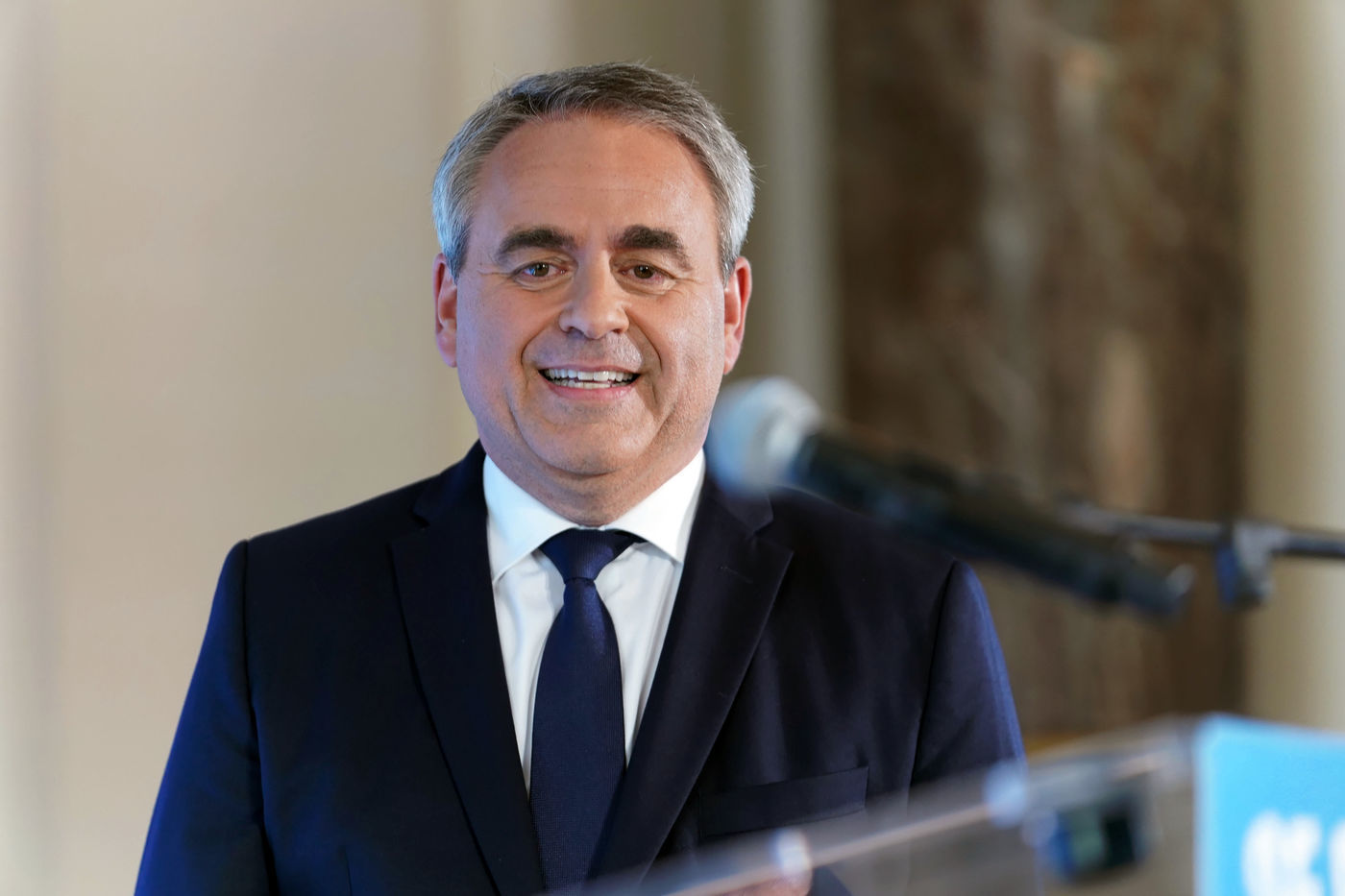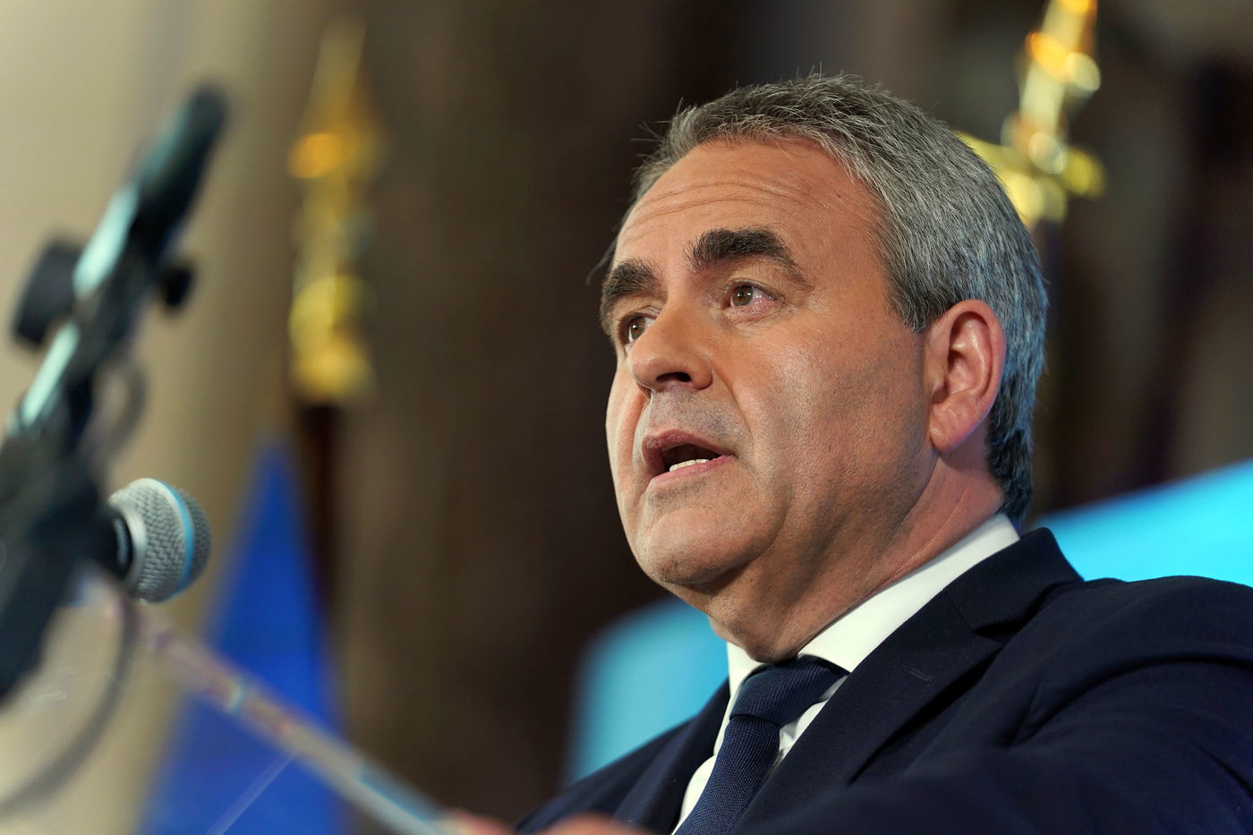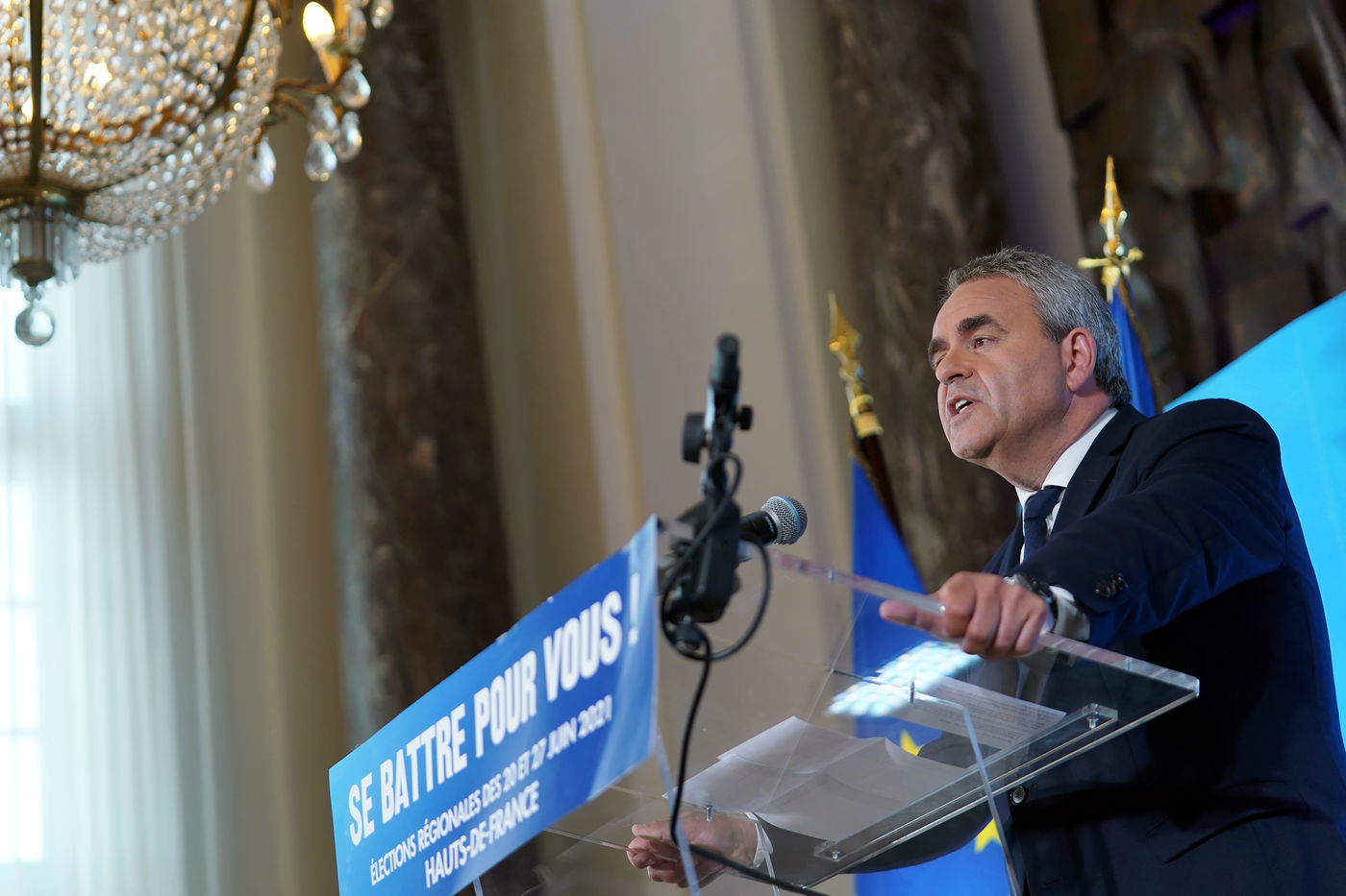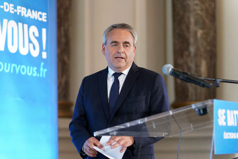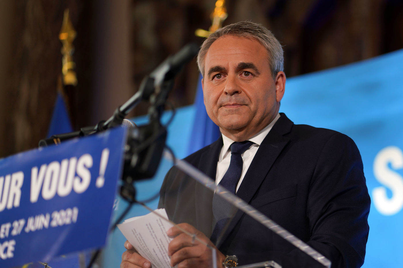 Xavier Bertrand, Les Republicains (LR) conservative party candidate who runs for his succession as Hauts-de-France region president, during electoral night of the second round of French regional and departmental elections, in Saint-Quentin, France, June 27. 2021.