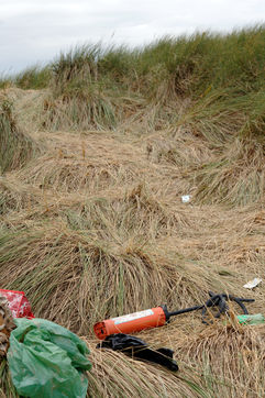Des effets personnels de migrant gisent dans le sable de la plage de Gravelines. Ils ont été abandonnés lors d'une tentative de traversée de la Manche, a Gravelines, pres de Dunkerque, France, le 12 Octobre 2021.